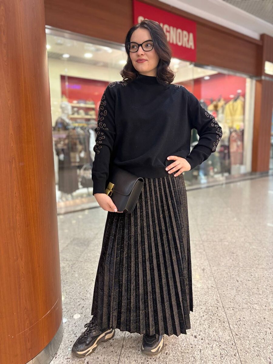Стильный монохромный комплект в черном цвете с украшениями на рукавах джемпера и глиттер на юбке 🌟 Сочетание строгое, но изящное и