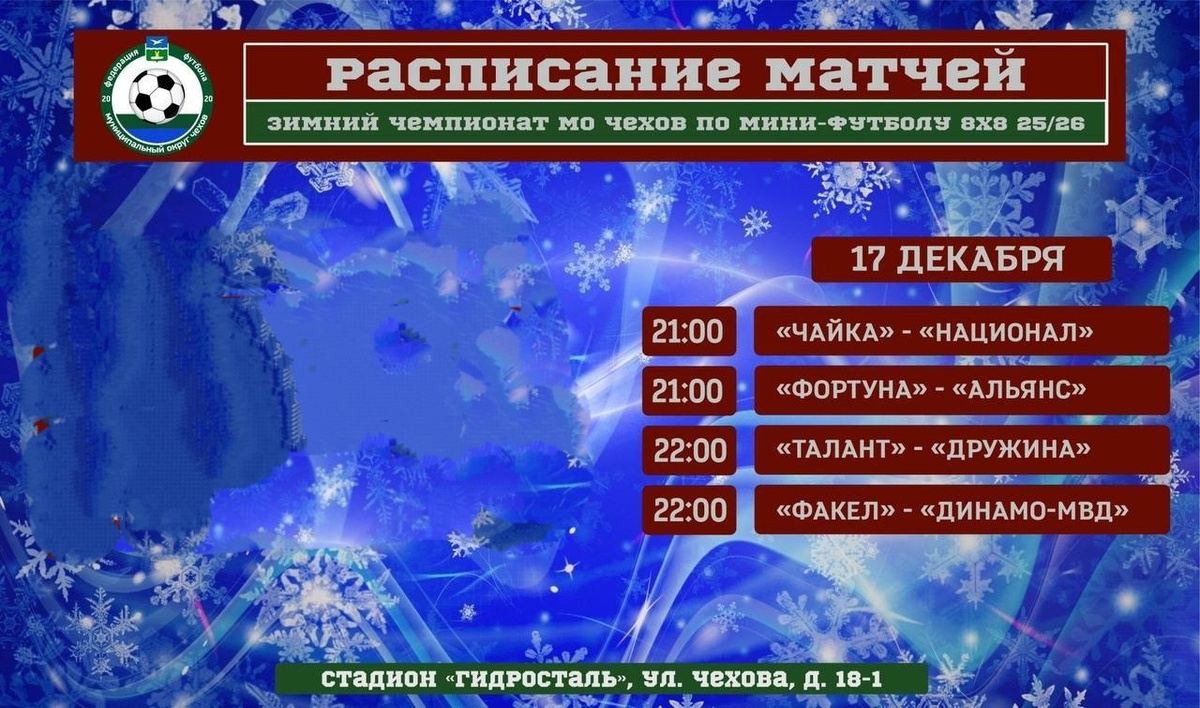 ✨ ЗИМНИЙ ЧЕМПИОНАТ ПО МИНИ-ФУТБОЛУ «8×8» ⚽️ Приглашаем поболеть за команды ☝️ 🚫 Возраст: 6+ 📆 17.12.2025 🏢 Стадион «Гидросталь» 📍 г. Чехов, ул. Чехова, д.4, стр.1 🪙 Вход свободный❗️ ⭐Поддержать канал голосом ✅ Мероприятия Чехов https://dzen.ru/id/66cc4b48e9ef144699238a51 http://vk.com/chekhov_events http://dzen.ru/chekhov_events