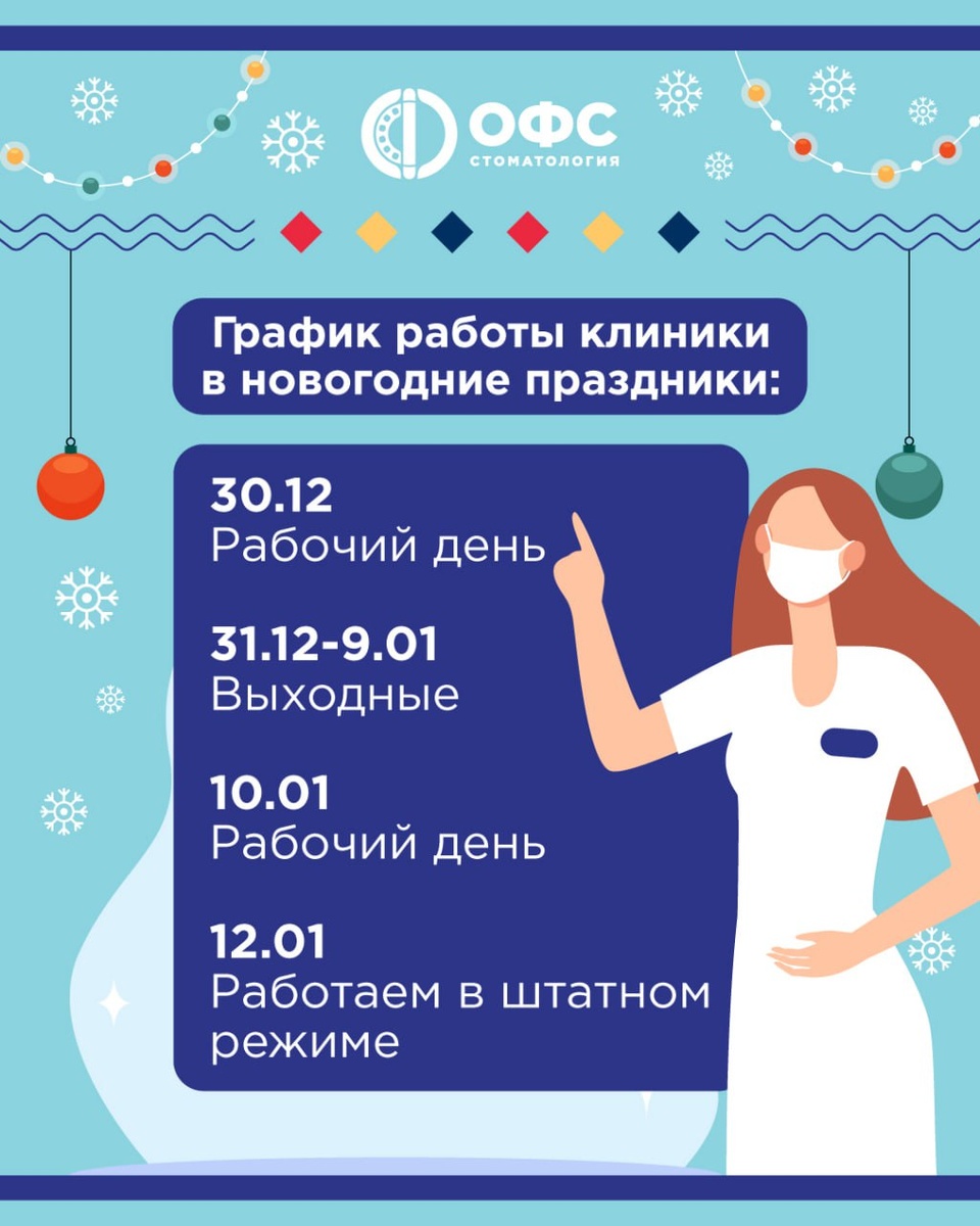 ! Во все времена встреча Нового года была связана со светлыми надеждами и искренним желанием порадовать близких. Этот праздник по-прежнему остается символом добра, заботы и веры в лучшее. В такие дни особенно хочется пожелать здоровья и благополучия — себе и тем, кто рядом, чтобы впереди было больше радости, спокойствия и улыбок. Есть старая добрая традиция — в новогодние дни дарить близким самое ценное: любовь, внимание и заботу. Иногда эта забота начинается с простых, но важных вещей — спокойного лечения, вовремя сделанной профгигиены или планового осмотра, который позволяет встретить праздники без ненужных тревог. Мы публикуем график работы клиники, чтобы у вас была возможность посетить клинику до праздничной паузы и встретить Новый год с легким сердцем. ✨☃️
