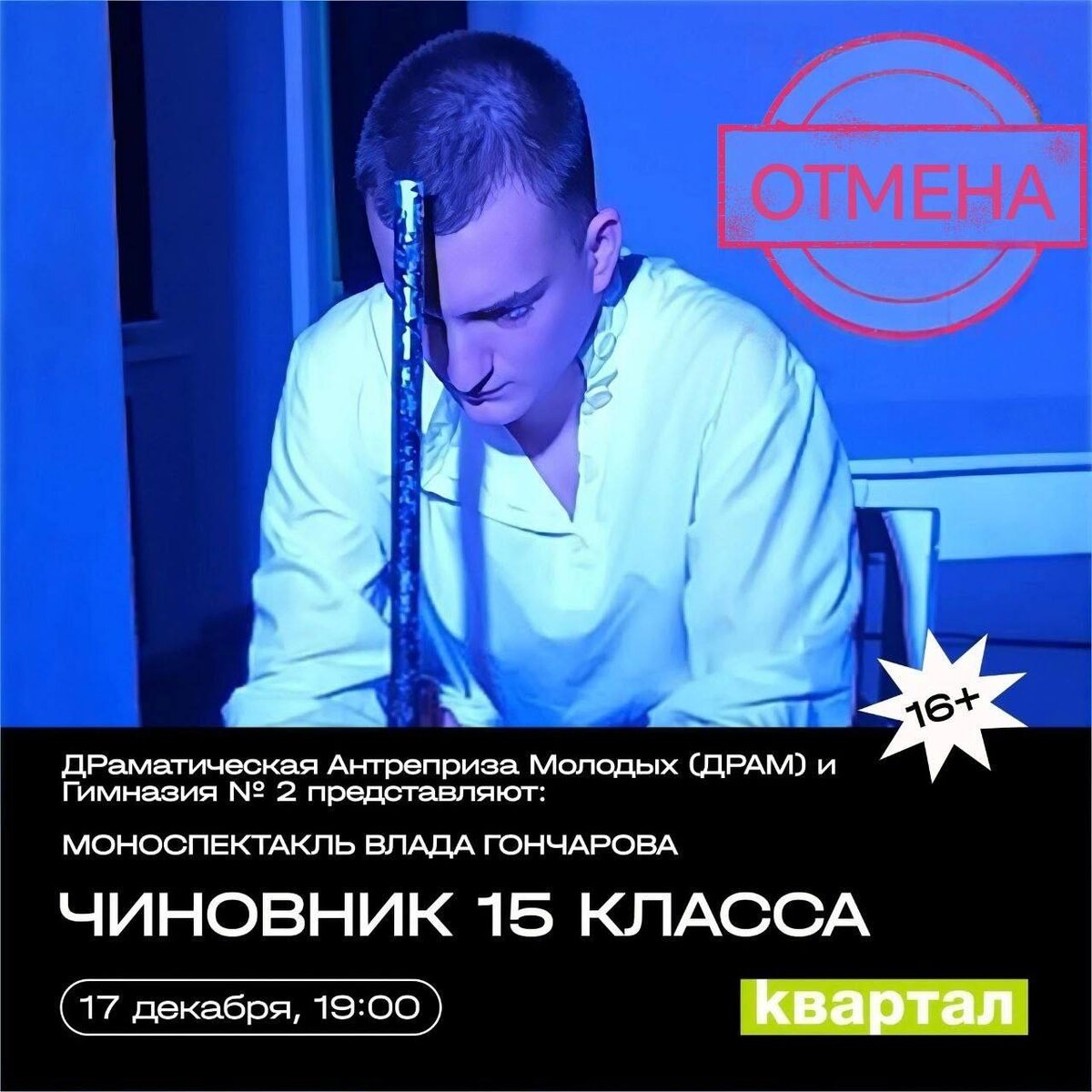 ДРаматическая Антреприза Молодых (ДРАМ) и Гимназия № 2 представляют: МОНОСПЕКТАКЛЬ ВЛАДА ГОНЧАРОВА "ЧИНОВНИК 15 КЛАССА" (по мотивам романа И. А. Гончарова "Обрыв") | 16+ 🗓️ 17 декабря, 19.00 📍Квартал, Ленина 78 В романе Гончарова про Татьяну Марковну Бережкову, её внучек и племянника человеку нового времени Марку Волохову уделяется ровно столько внимания, чтобы раскрыть черты неблагонамеренного выразителя революционных крайностей. В новом спектакле на первый план выходят чувства Волохова его мятущаяся душа, полная лирических переживаний. Его нравственное биполярное расстройство, которое и приводит молодого, умного и честного человека к краю Обрыва… 🏷️ свободные взносы #17декабря25@culturnik