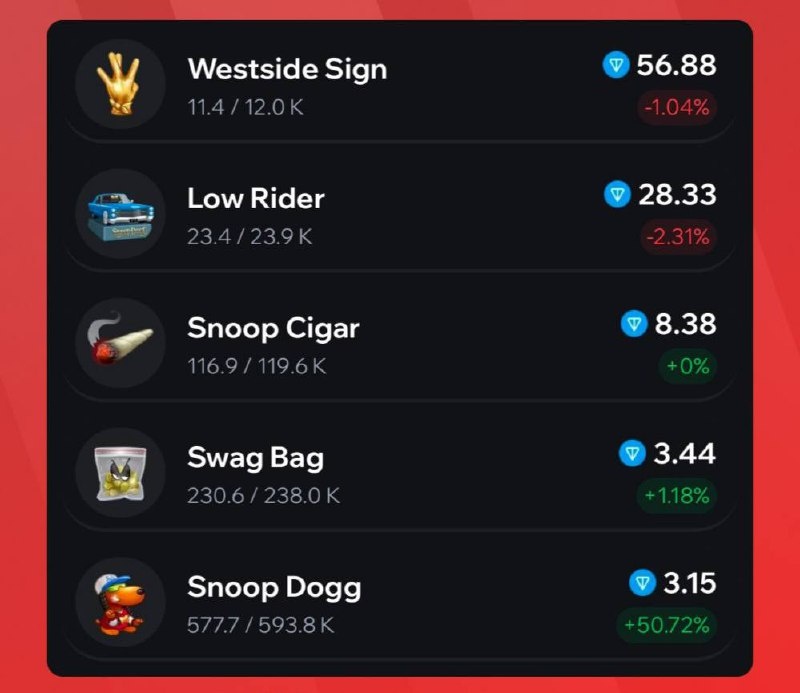 ! Если объединить все подарки из коллекции Snoop Dogg, то они обгоняют даже Кепку Дурова и уверенно занимают 2-е место по общей капитализации подарков! 🔥 Общая капитализация всех подарков от 🎁 Snoop Dogg — 4 880 000 TON (7 564 000$) Для сравнения: — 🎁 Кепка Дурова — 3 000 000 TON (4 650 000$) — 🎁 Пепка — 15 400 000 TON (23 870 000$) Детально это выглядит так: 🎁 Snoop Dogg — 1 800 000 TON (2 790 000$) 🚬 Snoop Cigar — 980 000 TON (1 519 000$) 🛍 Swag Bag — 793 000 TON (1 229 150$) 🚘 Low Rider — 663 000 TON (1 027 650$) 🖖 Westside Sign — 646 000 TON (1 001 300$) #gifts #TelegramGifts #nft ➖➖➖➖➖➖➖➖➖➖ 🎁 Где купить / продать подарки + гайд 🪙 Где брать звезды выгодно 💬 Общий чат