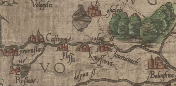 Плёсо на карте «Описание России, Московии и Тартарии», изданной английским послом и путешественником Энтони Дженкинсоном в 1562 году в Лондоне