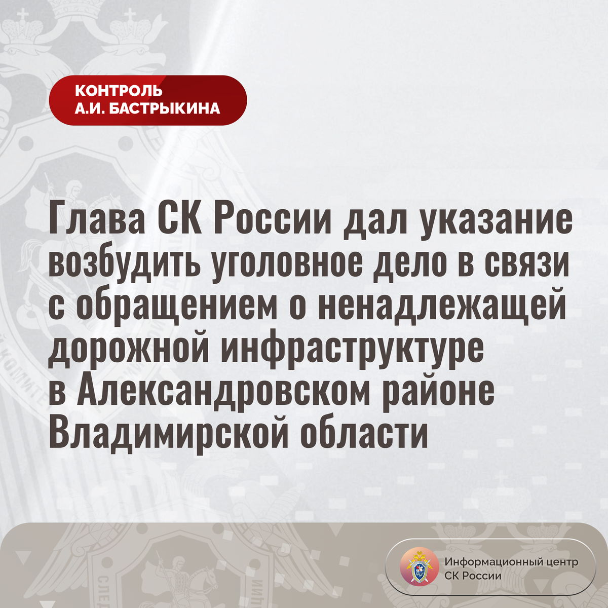 Глава СК России дал указание возбудить уголовное дело в связи с обращением о ненадлежащей дорожной инфраструктуре в Александровском районе Владимирской области В Информационный центр СК России поступило обращение по вопросу нарушения прав жителей Александровского района Владимирской области на качественную дорожную инфраструктуру. Длительное время автомобильная дорога, соединяющая деревни Вишняково и Рапусово, находится в непригодном состоянии: асфальтовое покрытие отсутствует, грунтовое полотно регулярно размывается, на поверхности образовались многочисленные ямы. В результате проезд транспортных средств затруднен. Многочисленные обращения в ответственные органы результатов не принесли, мер к организации ремонтных работ не принимается. Председатель Следственного комитета Российской Федерации Александр Иванович Бастрыкин дал указание руководителю СУ СК России по Владимирской области Артему Александровичу Кулакову возбудить уголовное дело и представить доклад о ходе и результатах его ра