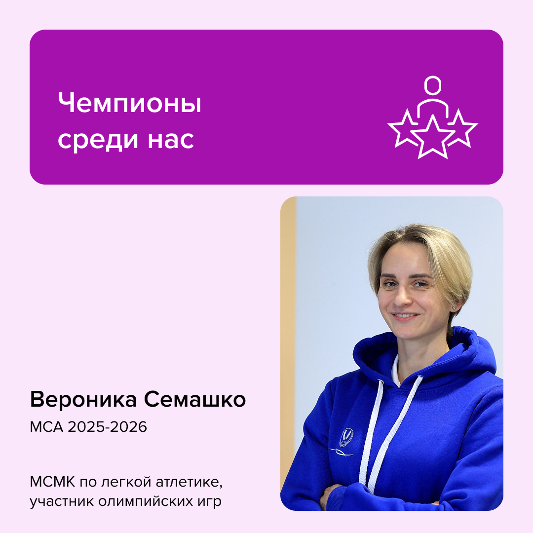 Вероника Семашко @veronika.semashko — студентка РМОУ и российская легкоатлетка, которая знает цену высоким стандартам. Олимпийские игры, чемпионство России, звание мастера спорта международного класса. Когда встал вопрос о дальнейшем развитии, планка осталась такой же высокой. РМОУ Вероника выбрала из-за престижа и возможностей. Университет дает управленческое образование в сфере спорта и помогает выстроить понятный вектор карьеры. Учиться здесь значит быть в среде сильных и мотивированных людей. Бонусом стал кампус на берегу Черного моря с южным климатом и видом, который каждый день напоминает, что учеба может быть комфортной. Единственное волнение перед поступлением было связано с конкурсом. Он высокий, а мест немного. Это не пугало, а скорее подстегивало. Было четкое желание попасть в число тех самых счастливчиков и использовать шанс по максимуму. Главная цель обучения для Вероники — рост. Она пришла в РМОУ за навыками, управленческими знаниями и новыми знакомствами. Веронике важно