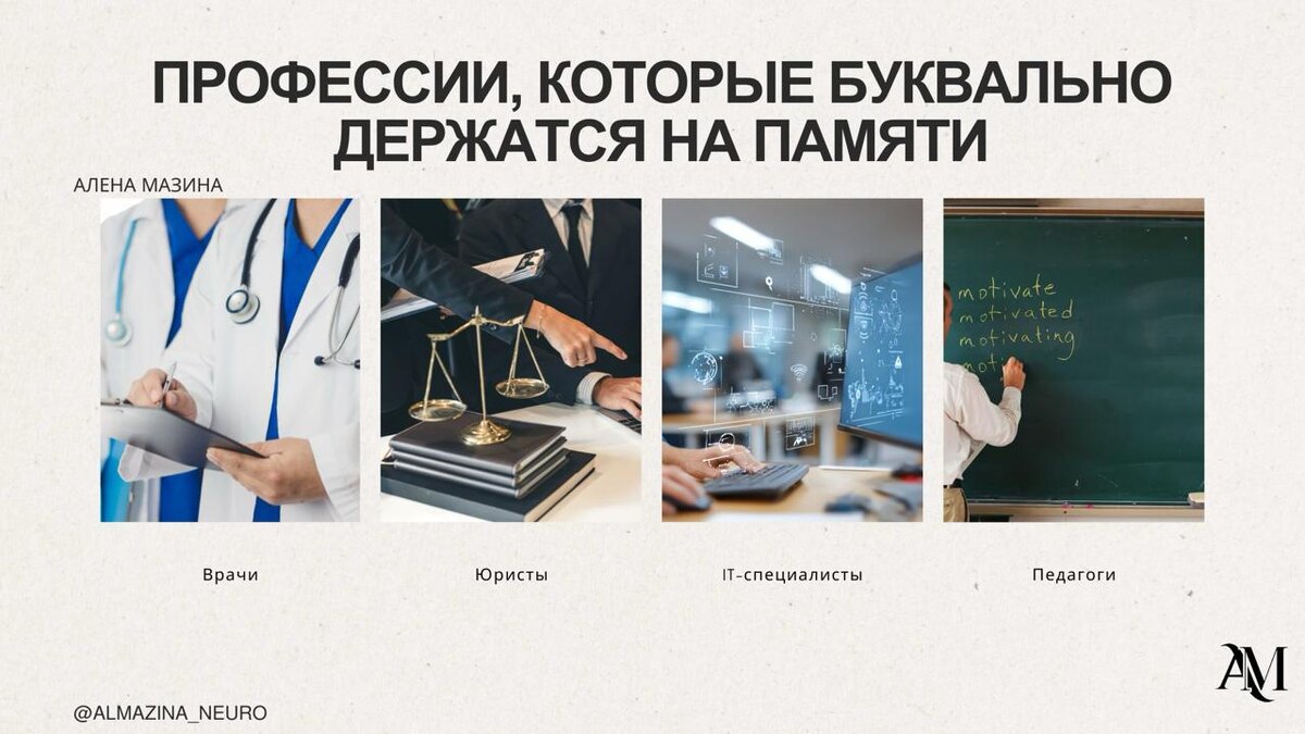 Разбор без иллюзий Мы часто говорим про талант, опыт, интеллект. Но почти никогда - про то, на чём всё это стоит. На памяти. Тихой, незаметной, но решающей. Эксперт - это не тот, кто «знает много». Эксперт - это тот, чей мозг быстро достаёт нужное в нужный момент. И именно поэтому память - не школьная тема. Это профессиональный инструмент. Причём критический. ПРОФЕССИИ, КОТОРЫЕ БУКВАЛЬНО ДЕРЖАТСЯ НА ПАМЯТИ 👩⚕️ Врачи Мозг должен: 🍃помнить симптомы, противопоказания, схемы лечения, 🍃распознавать паттерны, 🍃принимать решения быстро. Ошиблась память - ошибся диагноз. А цена ошибки - слишком высока. ⚖️ Юристы Законы, сроки, формулировки, прецеденты. Юрист не успевает «гуглить». Память - его внутренняя база данных. И чем она точнее, тем сильнее позиция. 💻 IT-специалисты Код, ошибки, логика, алгоритмы. Рабочая память - это «оперативка» мозга. Если она слабая → падает скорость анализа, растёт количество багов. 🧑🏫 Педагоги Одновременно: 🍃держат внимание класса, 🍃вспоминают