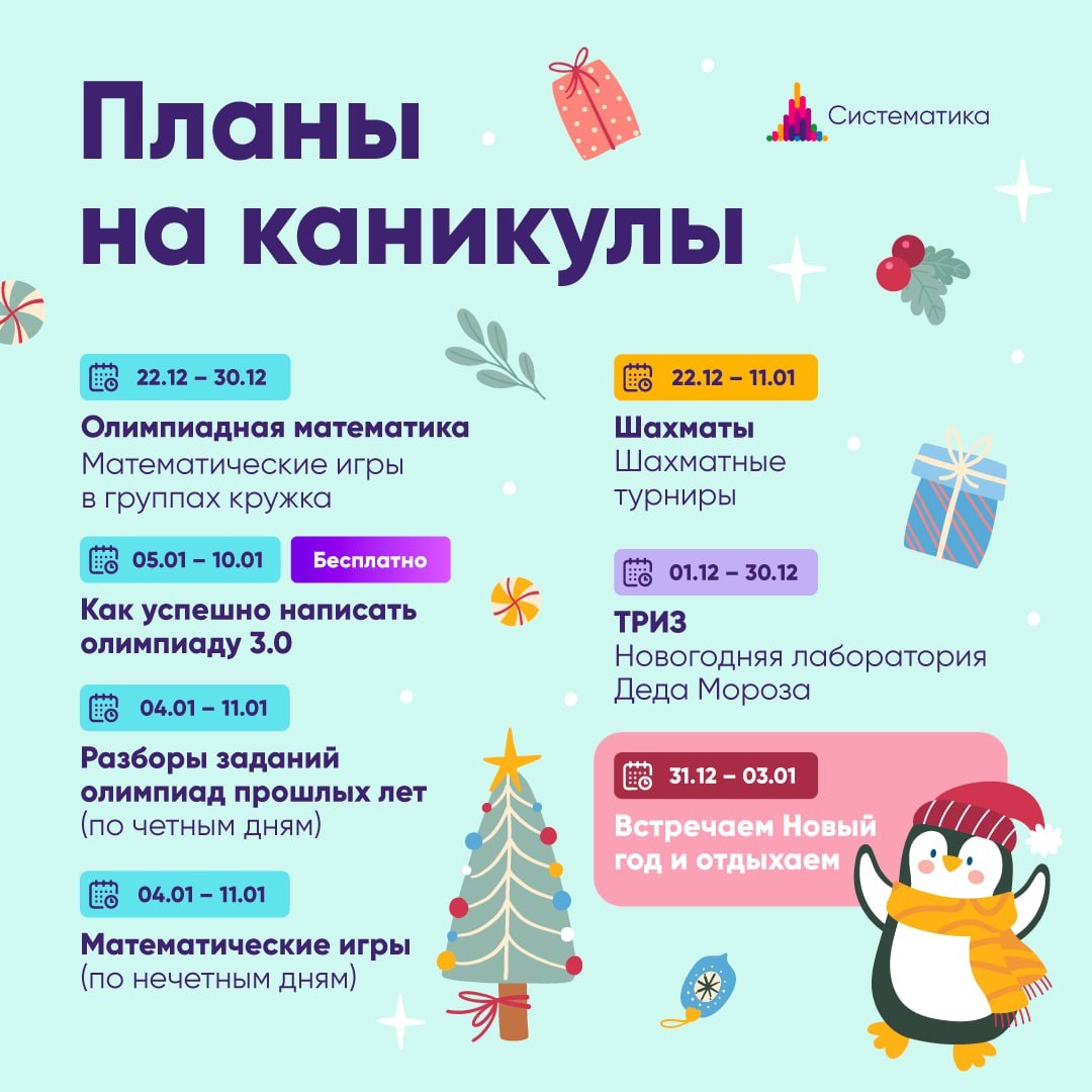 Друзья, уже скоро наступят каникулы, ура! Мы подготовили для вас насыщенную программу, скучать не придется. ОЛИМПИАДНАЯ МАТЕМАТИКА С 22 декабря по 11 января во всех группах кружка по олимпиадной математике мы традиционно играем в математические игры и разбираем самые сложные и интересные задачи известных олимпиад. 22.12 – 30.12 — играем в математические игры 31.12 – 03.01 — встречаем Новый год и отдыхаем 04.01 – 11.01 — по четным дням разбираем задания прошедших олимпиад (не Систематики), по нечетным — играем в математические игры. Игры проходят во всех группах из расписания кружка олимпиадной математики. Хотите попробовать? Рассказываем, как записаться ⬇️ ⏺️Если вы занимаетесь сейчас олимпиадной математикой, то вы уже записаны в свою группу. И можете записаться на игры в другие группы. ⏺️Если вы НЕ занимаетесь сейчас олимпиадной математикой в Систематике, вам нужно купить абонемент и записаться в удобную группу кружка Олимпиадной математики. 📎 ЗАРЕГИСТРИРОВАТЬСЯ НА МАТИГРЫ