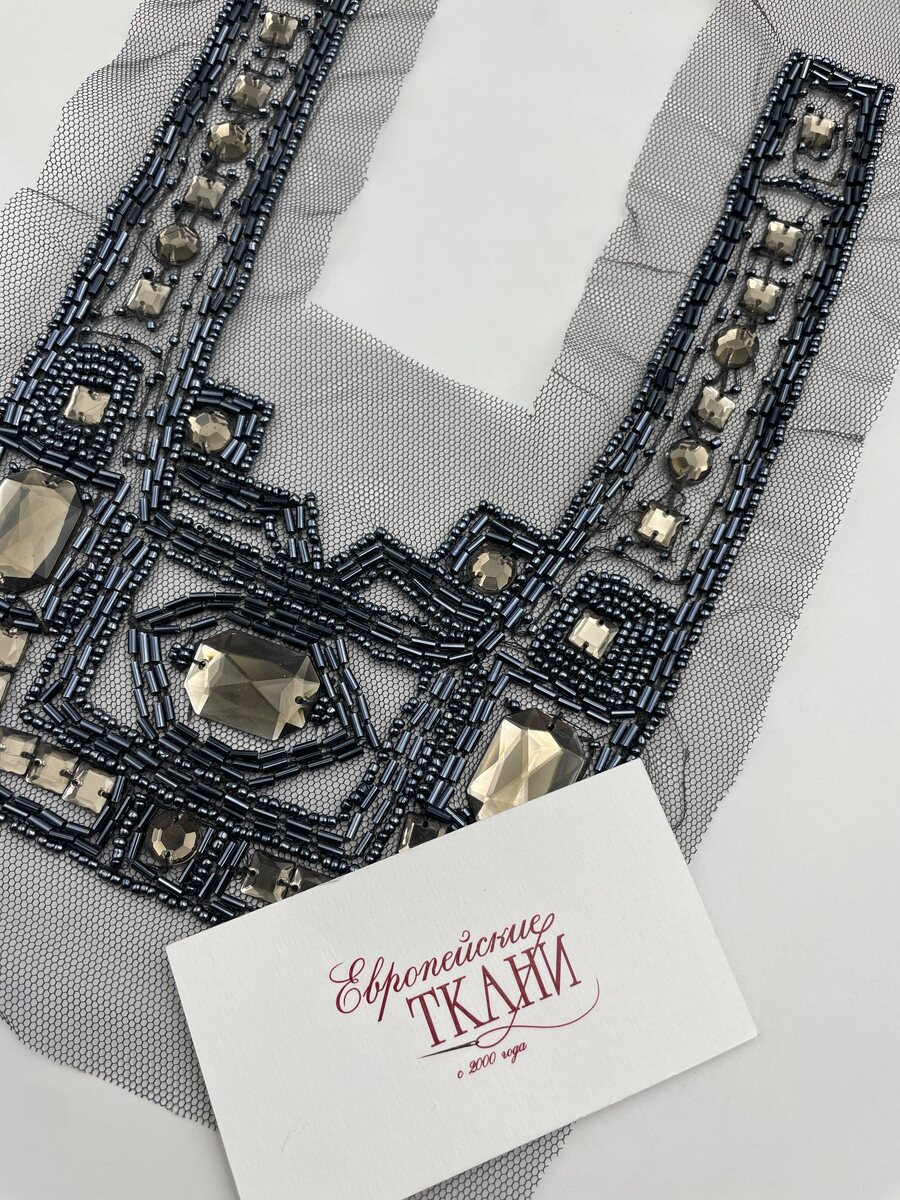 🖤Аппликация прямоугольная на вырез изделия с отделкой камнями и бисером на сетке, серая