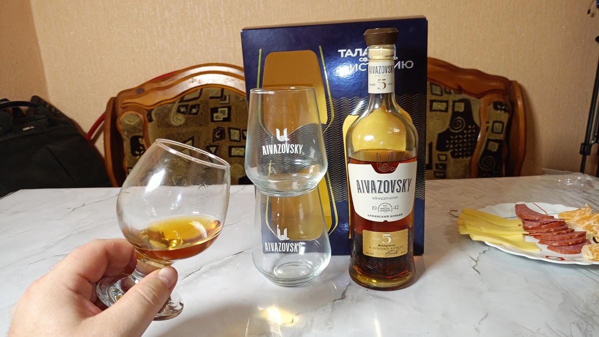 Всем привет, дорогие мои друзья! С вами, как обычно, Едаман. Сегодня у меня на обзоре будет коньяк. Давно хотел попробовать "Айвазовский", тем более он в подарочной упаковке. Очень даже презентабельный. Пятилетний армянский коньяк. Вообще Айвазовский, хвалили очень сильно. Талант создавать историю. Бутылочка, два стаканчика.