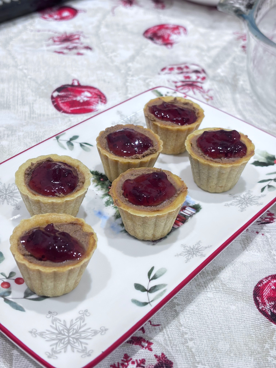 Тарталетки с печеночным паштетом и брусничным вареньем.