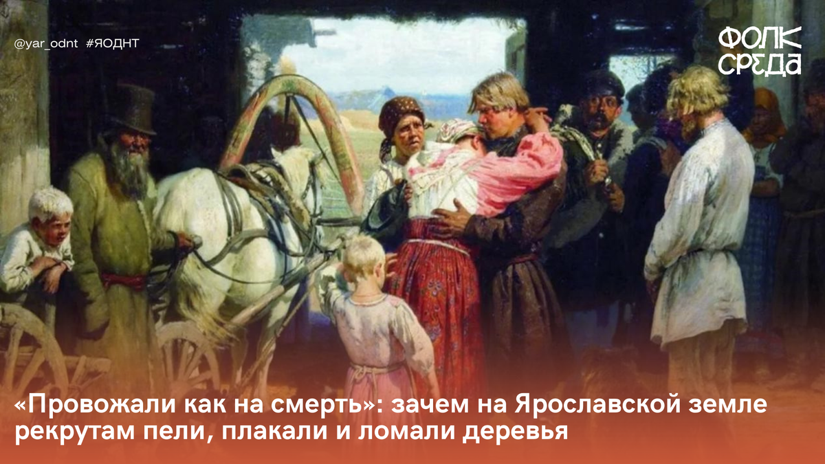 На Ярославской земле рекрутский обряд был одним из самых сложных и драматичных в традиционной культуре. Его воспринимали как рубеж, как переход из одного состояния в другое — зачастую необратимый.