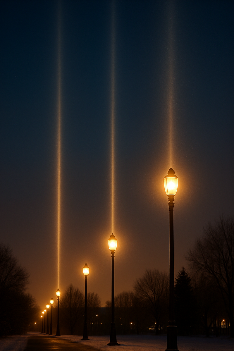 Представьте: вы выходите морозным вечером на улицу, поднимаете взгляд — и замираете. В небе словно зажглись гигантские неоновые лампы: вертикальные лучи света тянутся от фонарей вверх, будто кто‑то проткнул небо гигантскими световыми шпагами. Это не спецэффекты из фантастического фильма и не галлюцинация от холода — это световые столбы. Мы привыкли считать их просто красивой зимней причудой, но за этим явлением скрывается целая история открытий, ошибок и неожиданных разгадок. Сегодня вы узнаете, как учёные разгадывали эту небесную загадку — и что они нашли на самом деле. Ещё в старину путешественники и охотники рассказывали о странных огнях, поднимающихся от земли к небу. В северных легендах их называли «свечами духов» или «лестницами богов». Люди думали: это знаки свыше, предвестники важных событий. Но наука долго не обращала внимания на эти рассказы. Считалось, что это либо игра воображения, либо отблески полярного сияния. Пока однажды… В 1920‑х годах канадский метеоролог Джордж Симп