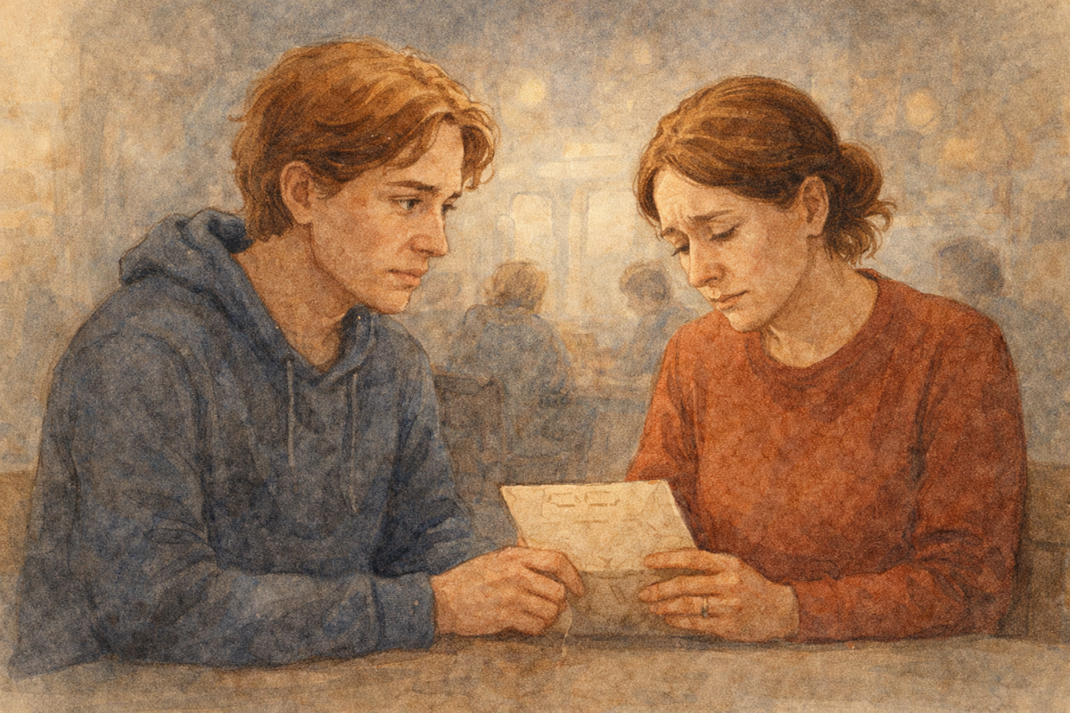 Он вошёл с привычной сутулостью человека, который несёт на себе не только рюкзак, но и жизнь. Волосы чуть мокрые, на щеках холод. Сел, улыбнулся быстро — как обязательную галочку поставил.