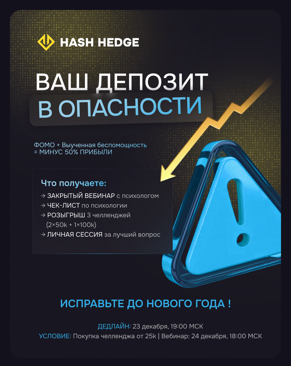 (только до 23 декабря) Если ты покупаешь любой челлендж Hash Hedge (https://hashhedge.com/?fpr=crypto_avantyurist)от 25k по моей ссылке, ты дополнительно получаешь: Закрытый вебинар с трейдинг-психологом