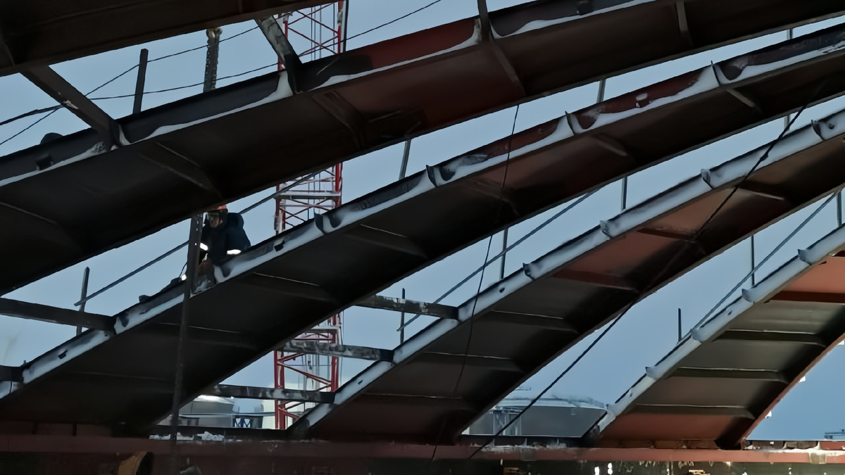 3. После полной сборки и сварки пояса, монтируется опорное кольцо крыши к стенке. А также, параллельно ведется монтаж временной стойки с центральной частью крыши;