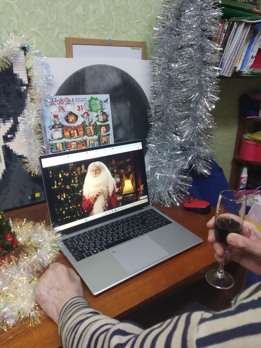 Мы сделали так: изобразили небольшой новогодний антураж, разлили бутылку вина по бокалам и усадили дедушку смотреть.
