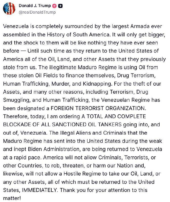 : «Венесуэла полностью окружена крупнейшей армадой, когда-либо собранной в истории Южной Америки. Она будет только расти, и удар по ним будет таким, какого они еще никогда не видели — до тех пор, пока они не вернут США всю нефть, землю и другие активы, которые они ранее украли у нас. Незаконный режим Мадуро использует нефть из этих украденных нефтяных месторождений для финансирования себя, наркотерроризма, торговли людьми, убийств и похищений. За кражу наших активов и по многим другим причинам, включая терроризм, контрабанду наркотиков и торговлю людьми, венесуэльский режим был признан иностранной террористической организацией. Поэтому сегодня я объявляю полную и преимущественную блокаду всех санкционированных нефтяных танкеров, заходящих в Венесуэлу и выходящих из неё. Америка не позволит преступникам, террористам или другим странам грабить, угрожать или причинять вред нашей нации и, точно так же, не позволит враждебному режиму захватить нашу нефть, землю или любые другие активы,