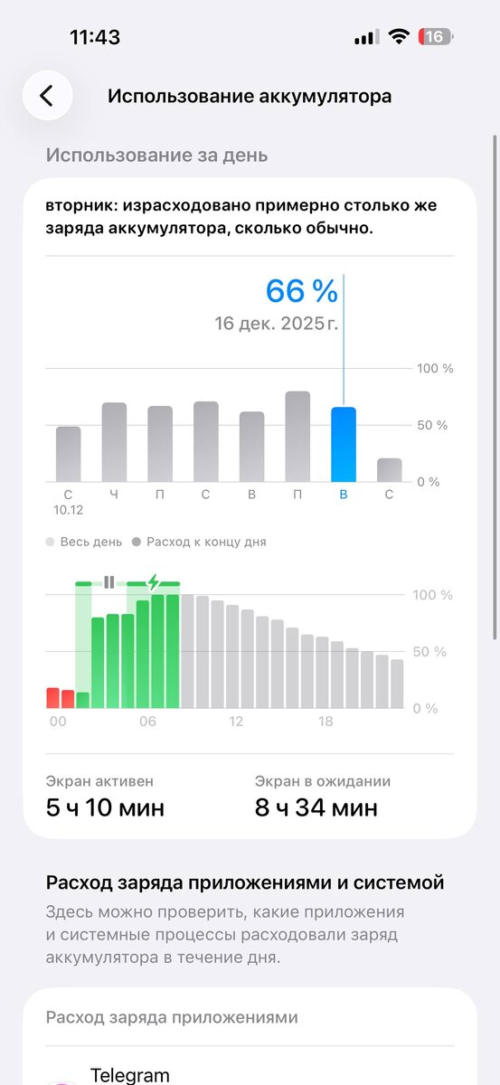 На уровне iOS 26.2, вообще никакой разницы, держит больше суток, еще приложил скриншот с приложениями, пользовался как обычно… но тут все не однозначно, у меня 16 ПМ и аккум 100%, на устройствах более старых все будет иначе 🤔