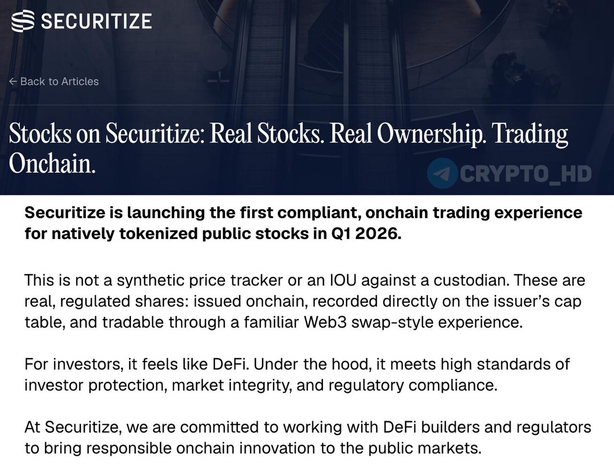 📈 В Securitize объявили о запуске первой регулируемой торговли реальными акциями на блокчейне Ethereum. Старт – в первом квартале 2026 года. Речь не об аналогах и не о «замене акций», а о настоящих акциях с прямым оформлением на владельца. Детали: ➤ Инвестор реально владеет акцией, а не «экспозицией». ➤ Полные права акционера: дивиденды и голосование. ➤ Самокастодиальное хранение. ➤ Возможны P2P-переводы между одобренными кошельками. ➤ Мгновенные расчеты и торговля 24/7. Когда американский рынок открыт, цена соответствует обычной бирже. Когда закрыт – торговля продолжается, и цена может меняться. Crypto Headlines