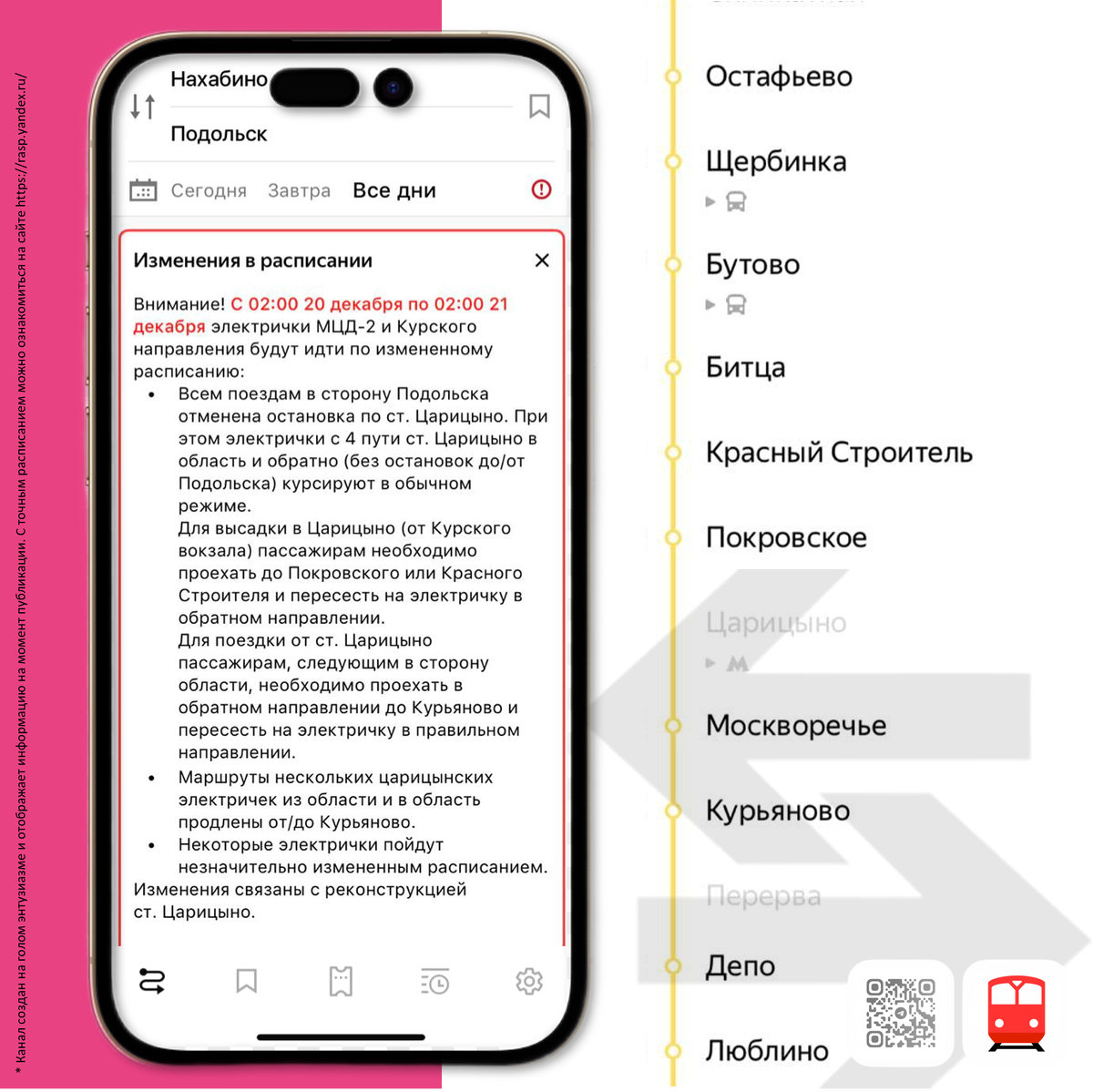 Π‘ 02:00 20 Π΄Π΅ΠΊΠ°Π±ΡΡ ΠΏΠΎ 02:00 22 Π΄Π΅ΠΊΠ°Π±ΡΡ ΡΠ»Π΅ΠΊΡΡΠΈΡΠΊΠΈ ΠΠ¦Π-2 ΠΈ ΠΡΡΡΠΊΠΎΠ³ΠΎ Π½Π°ΠΏΡΠ°Π²Π»Π΅Π½ΠΈΡ Π±ΡΠ΄ΡΡ ΠΈΠ΄ΡΠΈ ΠΏΠΎ ΠΈΠ·ΠΌΠ΅Π½Π΅Π½Π½ΠΎΠΌΡ ΡΠ°ΡΠΏΠΈΡΠ°Π½ΠΈΡ: β‘οΈ ΠΡΠ΅ΠΌ ΠΏΠΎΠ΅Π·Π΄Π°ΠΌ Π² ΡΡΠΎΡΠΎΠ½Ρ ΠΠΎΠ΄ΠΎΠ»ΡΡΠΊΠ° ΠΎΡΠΌΠ΅Π½Π΅Π½Π° ΠΎΡΡΠ°Π½ΠΎΠ²ΠΊΠ° ΠΏΠΎ ΡΡ. Π¦Π°ΡΠΈΡΡΠ½ΠΎ. ΠΡΠΈ ΡΡΠΎΠΌ ΡΠ»Π΅ΠΊΡΡΠΈΡΠΊΠΈ Ρ 4 ΠΏΡΡΠΈ ΡΡ. Π¦Π°ΡΠΈΡΡΠ½ΠΎ Π² ΠΎΠ±Π»Π°ΡΡΡ ΠΈ ΠΎΠ±ΡΠ°ΡΠ½ΠΎ (Π±Π΅Π· ΠΎΡΡΠ°Π½ΠΎΠ²ΠΎΠΊ Π΄ΠΎ/ΠΎΡ ΠΠΎΠ΄ΠΎΠ»ΡΡΠΊΠ°) ΠΊΡΡΡΠΈΡΡΡΡ Π² ΠΎΠ±ΡΡΠ½ΠΎΠΌ ΡΠ΅ΠΆΠΈΠΌΠ΅. ΠΠ»Ρ Π²ΡΡΠ°Π΄ΠΊΠΈ Π² Π¦Π°ΡΠΈΡΡΠ½ΠΎ (ΠΎΡ ΠΡΡΡΠΊΠΎΠ³ΠΎ Π²ΠΎΠΊΠ·Π°Π»Π°) ΠΏΠ°ΡΡΠ°ΠΆΠΈΡΠ°ΠΌ Π½Π΅ΠΎΠ±Ρ