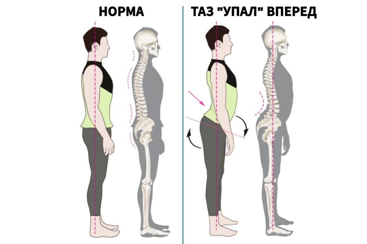 Часто мы не замечаем, как стоим, сидим или двигаемся, пока тело не начинает подавать тревожные сигналы. А ведь именно от нашего привычного положения зависит не только внешний вид, но и здоровье внутренних органов, суставов и даже настроение! Сегодня поговорим об одной из самых распространенных, но часто игнорируемых проблем – неправильном положении таза. Посмотрите на картинку справа. Видите, как таз будто "завален" вперед, выпячивая живот и чрезмерно прогибая поясницу? Почему так происходит? Причин может быть множество: • Желание "визуально увеличить ягодицы" часто приводит к неосознанному принятию неестественной позы. • Долгие часы в офисе, неправильное положение за столом или на диване, слабые мышцы кора и напряженные сгибатели бедра. • Слабые ягодичные мышцы и мышцы живота в сочетании с укороченными пояснично-подвздошными мышцами и мышцами-разгибателями спины. Какова бы ни была причина, результат один – хроническое напряжение и целый каскад проблем по всему телу. Казалось бы, н