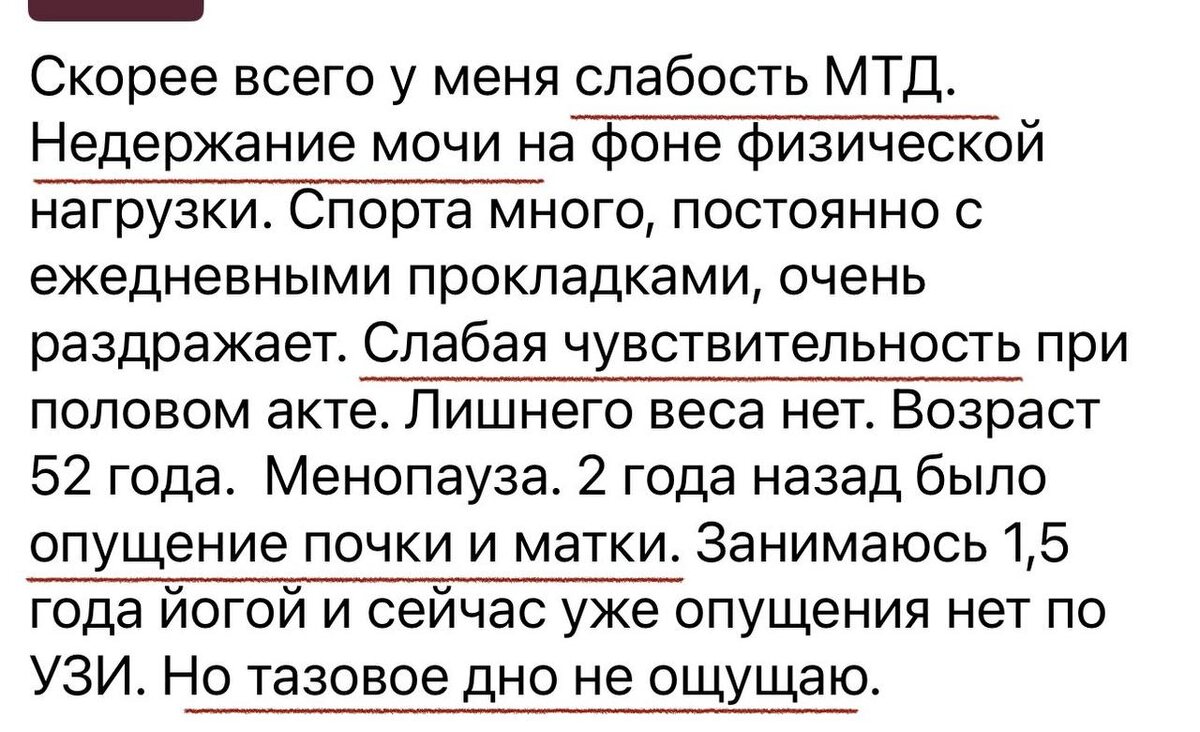 »: Скорее всего у меня слабость МТД. Недержание мочи на фоне физической нагрузки. Спорта много, постоянно с ежедневными прокладками, очень раздражает. Слабая чувствительность при половом акте. Лишнего веса нет. Возраст 52 года. Менопауза. 2 года назад было опущение почки и матки. Занимаюсь 1,5 года йогой и сейчас уже опущения нет по УЗИ. Но тазовое дно не ощущаю. Симптомы, которые сильно портят качество жизни женщин, и очень ограничивают их в желаемой активности💯 На курсе с помощью гармонично-составленных комплексов упражнений, мы восстанавливаем тело и возвращаем качество жизни❤️ У 25-го потока доступ аж до 8 марта🔥, что на две недели больше обычного. ПРИСОЕДИНИТЬСЯ >>>