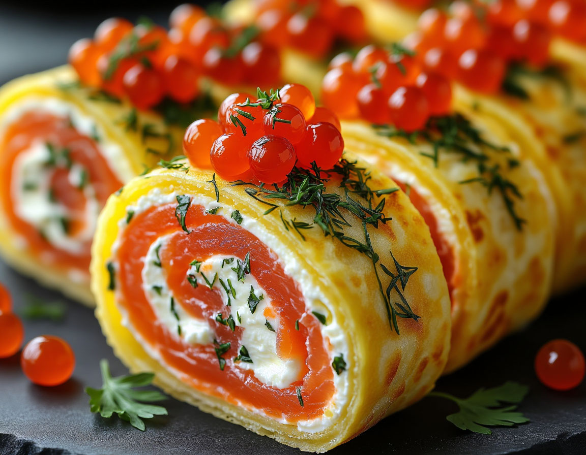 Если обычные блины с рыбой кажутся вам слишком простыми, попробуйте приготовить блинный рулет. Это эффектная холодная закуска, которая в разрезе напоминает изысканные роллы. Нежный сливочный сыр, тончайший вкус слабосоленого лосося и ароматная зелень в обрамлении домашнего блина — идеальное сочетание для 2025 года.