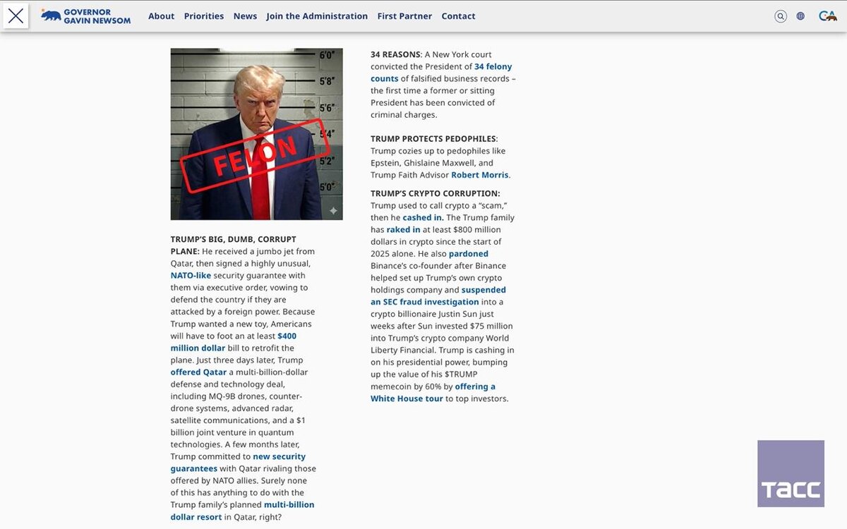 ". Губернатор Калифорнии создал веб-страницу с уголовными делами Трампа и более 10 его соратников, которые обвинены в тяжких преступлениях (мошенничество, коррупция и торговля наркотиками) или задержаны по делу о штурме Капитолия. Заря | Новости - Подписаться