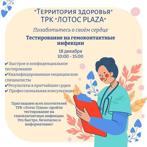! Π§ΡΠΎ Π²Π°Ρ ΠΆΠ΄Π΅Ρ: β’ ΠΡΡΡΡΠΎΠ΅ ΠΈ ΠΊΠΎΠ½ΡΠΈΠ΄Π΅Π½ΡΠΈΠ°Π»ΡΠ½ΠΎΠ΅ ΡΠ΅ΡΡΠΈΡΠΎΠ²Π°Π½ΠΈΠ΅ β’ ΠΠ²Π°Π»ΠΈΡΠΈΡΠΈΡΠΎΠ²Π°Π½Π½ΡΠ΅ ΠΌΠ΅Π΄ΠΈΡΠΈΠ½ΡΠΊΠΈΠ΅ ΡΠΏΠ΅ΡΠΈΠ°Π»ΠΈΡΡΡ β’ Π Π΅Π·ΡΠ»ΡΡΠ°ΡΡ Π² ΠΊΡΠ°ΡΡΠ°ΠΉΡΠΈΠ΅ ΡΡΠΎΠΊΠΈ β’ ΠΡΠΎΡΠ΅ΡΡΠΈΠΎΠ½Π°Π»ΡΠ½Π°Ρ ΠΊΠΎΠ½ΡΡΠ»ΡΡΠ°ΡΠΈΡ πΉ ΠΠ΄Π΅: Π’Π Π Β«ΠΠΠ’ΠΠ‘ PLAZAΒ», Β«Π’Π΅ΡΡΠΈΡΠΎΡΠΈΡ Π·Π΄ΠΎΡΠΎΠ²ΡΡΒ» πΉ ΠΠΎΠ³Π΄Π°: 18 Π΄Π΅ΠΊΠ°Π±ΡΡ, 10:00-15:00 πΉ Π‘ΡΠΎΠΈΠΌΠΎΡΡΡ: ΠΠΠ‘ΠΠΠΠ’ΠΠ
