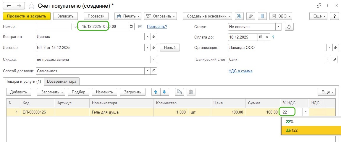 Как выставить в 2025 году счет со ставкой НДС 22% в Бухгалтерии 3.0