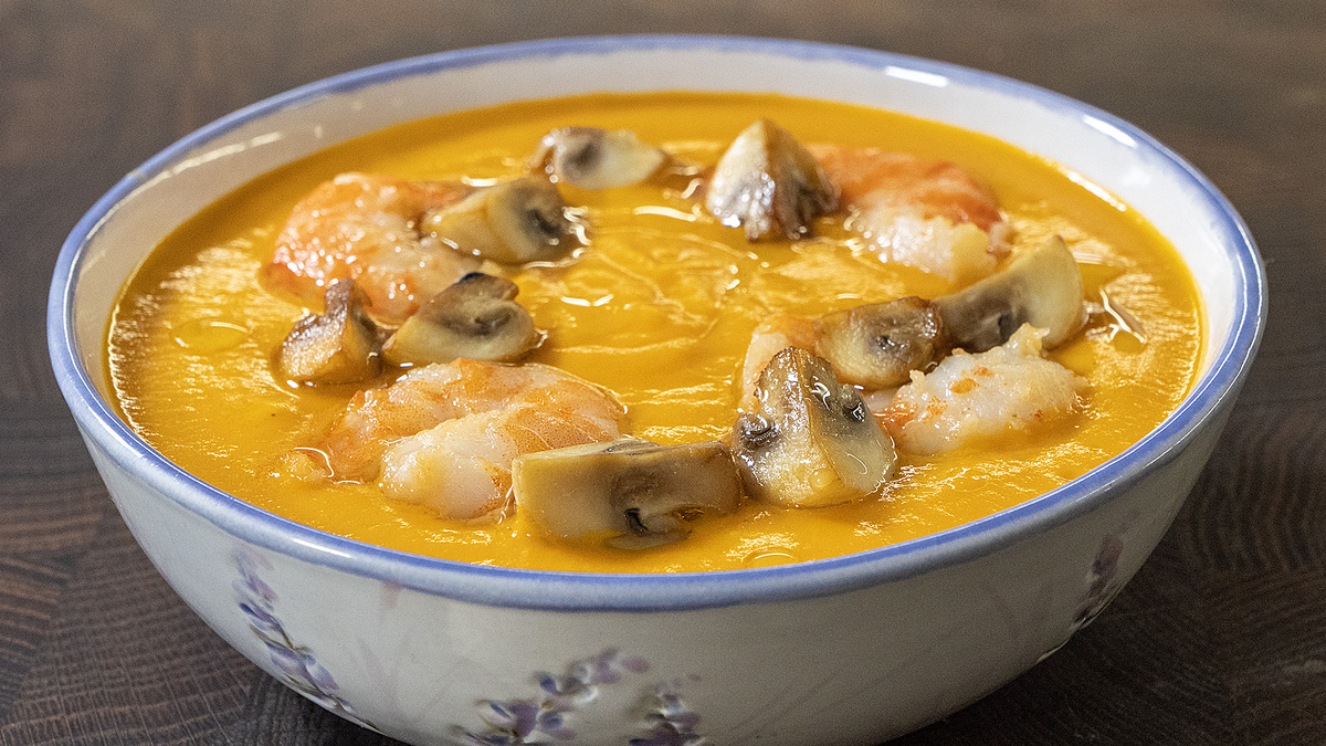 Шикарный рецепт тыквенного супа Том Ям с креветками и шампиньонами. Вкусный и ароматный суп с нежной текстурой и незабываемым вкусом, который не оставит равнодушными даже самых избалованных гурманов. Обязательно приготовьте и сами оцените насколько это вкусно! Тыкву и морковь очищаем от кожицы и нарезаем крупными кусочками. Небольшими кубиками нарезаем лук и мелко шинкуем имбирь. Все овощи отправляем на сковороду и обжариваем на растительном масле. Через пару минут отправляем к овощам мелко нарезанный чеснок и перемешиваем. Обжариваем всё еще пару минут, по вкусу солим-перчим, добавляем пасту Том Ям, а также рубленные томаты в собственном соку. Все хорошенько перемешиваем, наливаем куриный бульон и кокосовое молоко. Не забываем добавить лимонный сок и под закрытой крышкой на небольшом огне тушим всё до размягчения овощей. На 4 части разрезаем шампиньоны и обжариваем до румянца на растительном масле, добавив дольку чеснока для аромата. На сливочном масле слегка прогреваем очищенные кре
