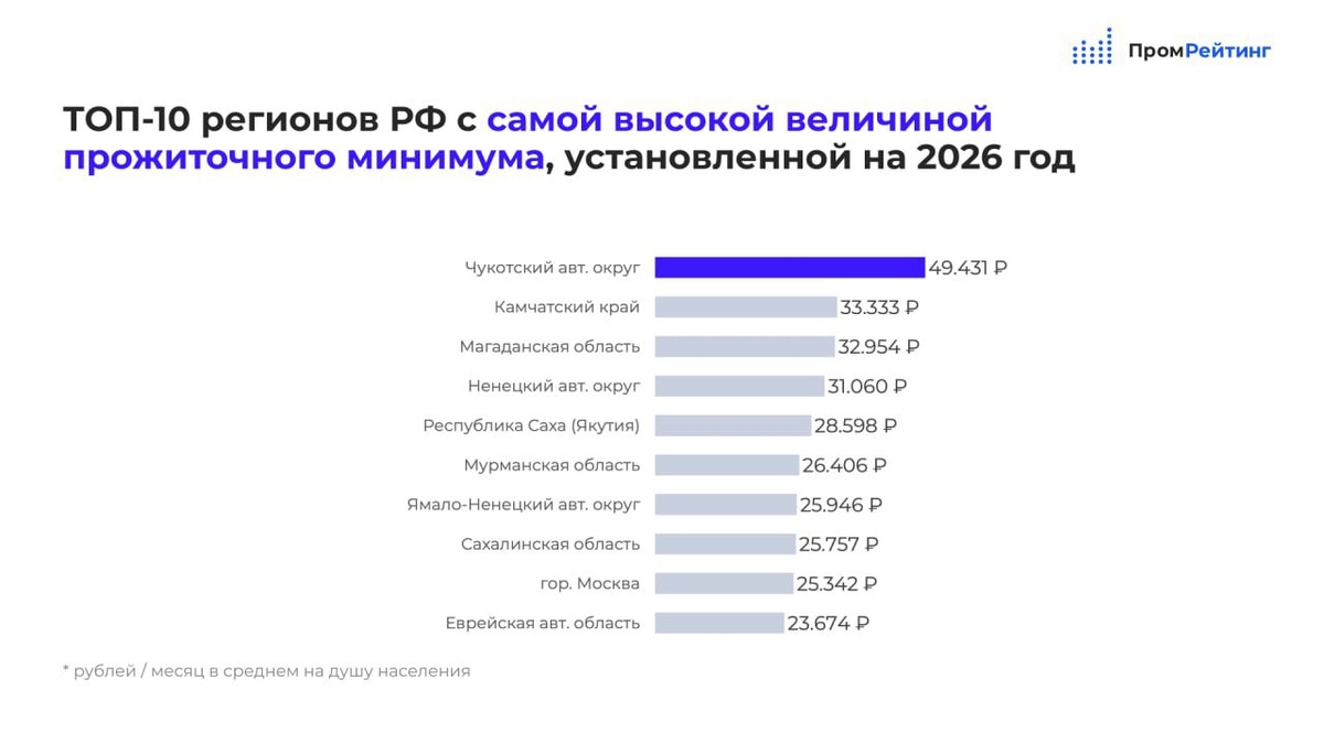 Мурманская область вошла в ТОП-10 росийских регионов по величине прожиточного минимума, установленного в субъектах на 2026 год. По данным агентства «ПромРейтинг», Заполярье с 26406 рублями расположилось на шестой строчке, «пропустив» вперёд Чукотку, Камчатку, Магаданскую область, НАО и Якутию. ❄ «Арктический Обозреватель» // По материалам агентства «ПромРейтинг».
