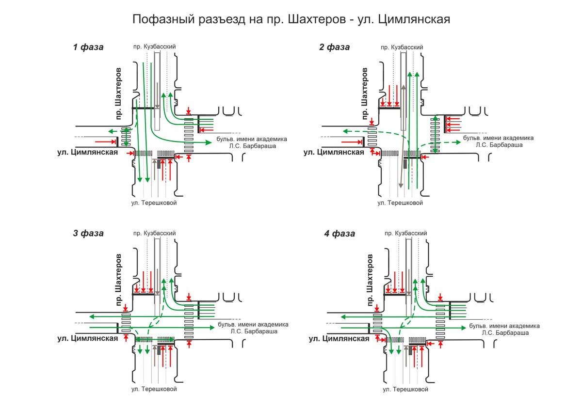 В кузбасской столице перенастроят светофоры на оживлённом перекрёстке. Дорожники надеются так повысить безопасность. В четверг, 18 декабря, изменится схема проезда пересечения проспекта Шахтёров и улицы Цимлянской, предупреждает горадминистрация в среду. – Специалисты Центра организации дорожного движения разделят транспортные потоки по пр. Шахтёров на разные фазы, что обеспечит безопасный поворот налево с обоих направлений, – заявили в мэрии. Там будет четыре фазы: Первая: машины поедут по проспекту Шахтёров от проспекта Кузбасского и дополнительной секции направо по бульвару Барбараша от улицы Институтской, пешеходы пойдут по нечётной стороне Шахтёров; вторая: транспорт – по проспекту Шахтёров от улицы Терешковой, пешеходы – по чётной стороне Шахтёров, а также трамваи; третья: транспорт – по улице Цимлянской и бульвару Барбараша с дополнительной секцией направо, пешеходы – через проспект Шахтёров; четвёртая: транспорт – по улице Цимлянской и бульвару Барбараша с дополнительной секцие