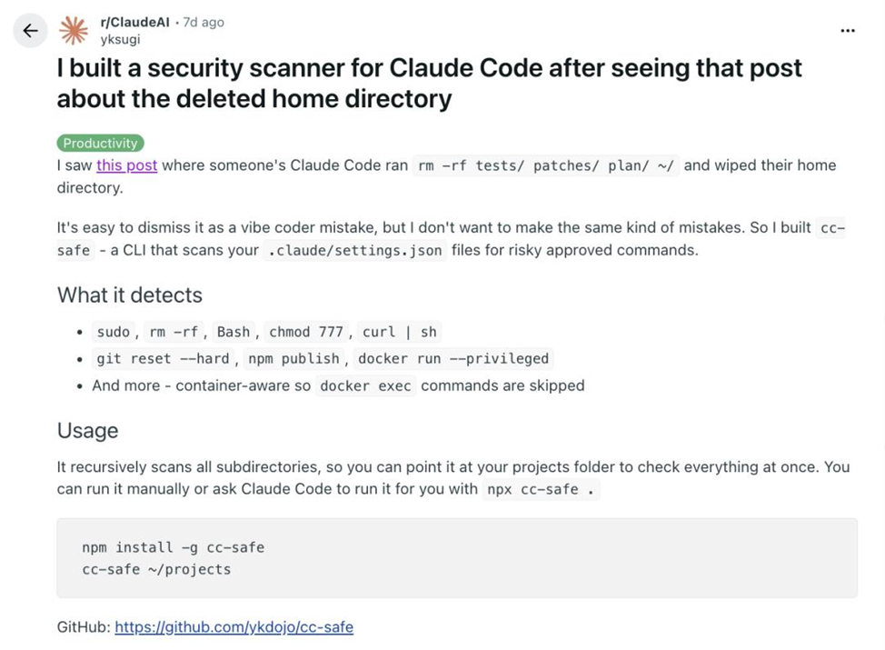 - Промежуточные защитные утилиты. Разработчик yksugi создал cc-safe — CLI‑утилиту, которая сканирует файл настроек .claude/settings.json, ищет уже авторизованные команды и блокирует высокорисковые: