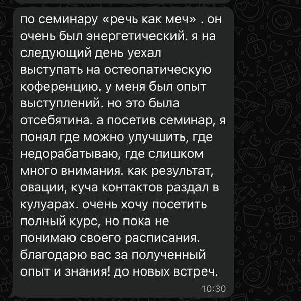 Кайфую от таких живых жизненных отзывов ⬆️. Пришёл человек на тренинг «Речь как меч», а на следующий день поехал выступать на конференции. Опыт у него был, но, как он сам написал, раньше говорил «отсебятину». А после тренинга понял, где он теряет внимание, где перегружает зал, а где вообще сам себе мешает. ✅ Применил новые знания и получил результат: овации, куча новых контактов и понимание как делать эффективнее. Радуюсь таким искренним отзывам и тому, что люди сразу получают пользу и результат. Всё-таки навык, который человек уносит с собой в карьеру, жизнь — крутой подарок самому себе. ✨ А скоро Новый год. И все уже ломают голову, что подарить друзьям, коллегам, близким, любимым. И я сделал подарочные сертификаты на мои программы. Чтобы каждый мог подарить крутой навык, яркое впечатление и что-то новое в одно флаконе. Можно оформить сертификат на любую из моих программ: ➡️ 2-х часовой тренинг «Речь как меч» — отличный вариант для коллеги, друга или сотрудника. ➡️ Курс «Пятый элемент