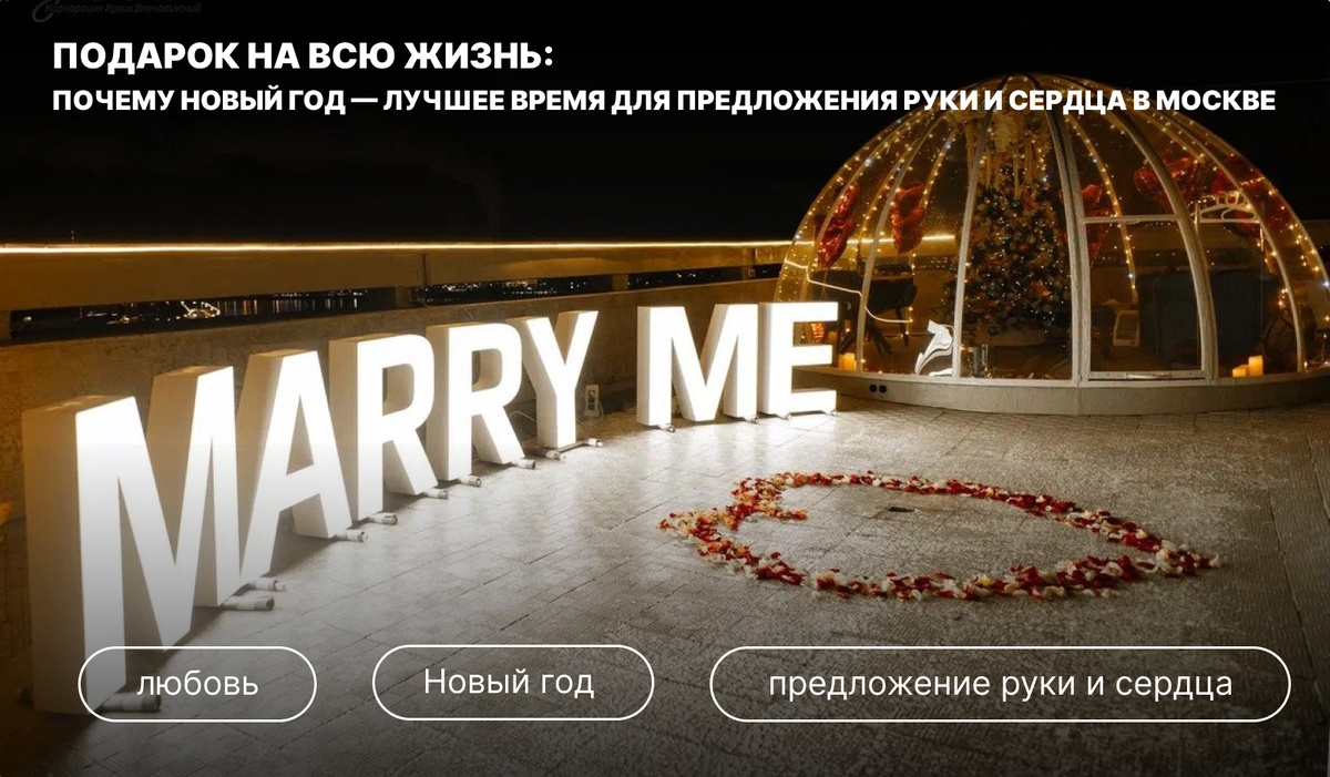Новый год в Москве — это не просто праздник, а масштабный фильм о чудесах, в котором каждый может стать главным героем своей истории любви. Город переливается огнями, на ВДНХ, в центре и в парках звучит музыка, витрины сияют, а воздух пропитан ощущением перемен и надежды. Именно в этой атмосфере особенно ясно ощущается желание начать новую главу жизни — и сделать предложение руки и сердца становится не просто романтическим жестом, а символом нового этапа для двоих. Новый год — редкий праздник, который сам по себе связан с обновлением, планами и мечтами, и каждая пара втайне загадывает хоть одно желание «про нас». Сделать предложение в этот период — значит превратить абстрактные мечты в конкретное «да», с которого начинается семейная история. Каждый следующий Новый год будет напоминать вам не только о бою курантов, но и о том моменте, когда вы решили навсегда остаться рядом, и это создаёт особую семейную традицию, наполненную смыслом. Зимняя Москва буквально создана для романтики: огни