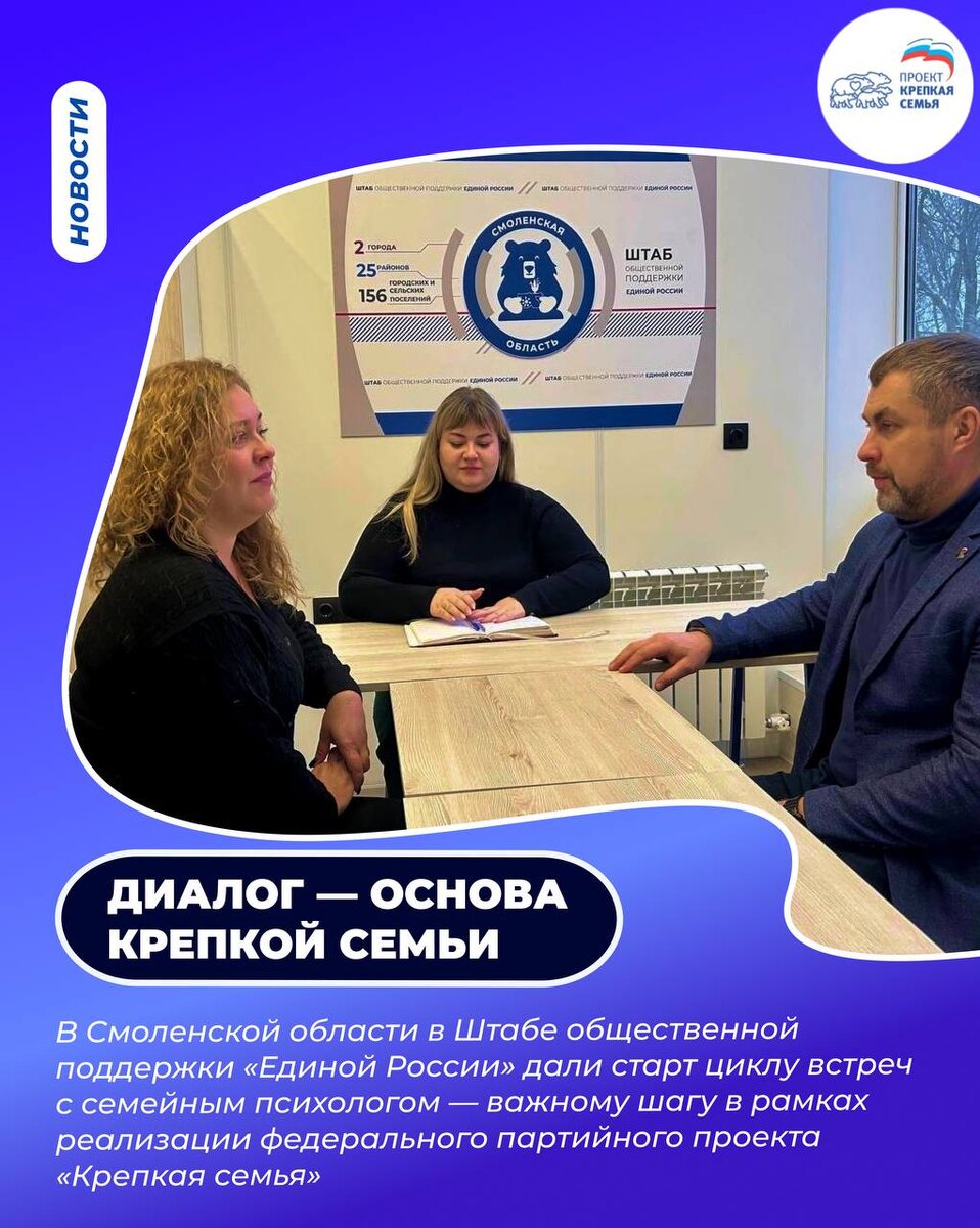 ✅ В Штабе общественной поддержки «Единой России» Смоленской области дан старт циклу встреч с семейным психологом — важному шагу в рамках реализации федерального партийного проекта «Крепкая семья». ⚡️ Инициаторами проекта выступили региональный координатор федерального партийного проекта «Крепкая семья» Елена Амельченкова и руководитель Штаба общественной поддержки «Единой России» в Смоленской области Андрей Моргунов. 🔹 В планах — организация прямого эфира, где будут разобраны самые актуальные вопросы семейных взаимоотношений. Спикер — Дарья Селезнева — психолог, член Общероссийской профессиональной психотерапевтической лиги. Ее опыт открывает новые возможности для укрепления семейных отношений и помогает находить точки соприкосновения даже в сложных ситуациях. 👏 Семья остается нашим главным богатством. Залог крепких отношений — в открытом диалоге, взаимном уважении и готовности слышать друг друга! #КрепкаяСемья #ЕдинаяРоссия #ТатьянаБуцкая #ЕР #ПартийныеПроекты #КС #ЕР67