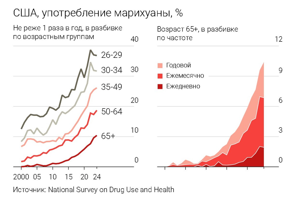 После легализации марихуаны в США выросла частота её употребления. И кто бы мог подумать, что в топе по её употреблению станут люди старше 65 лет? В 2007 году каннабис пробовали лишь 1 из 300 пенсионеров (в год), а сейчас это уже 1 из 10, причём 1 из 15 использует его ежемесячно. Объясняют это тем, многие из сегодняшних пенсионеров принадлежат к поколению хиппи (50+% тех, кто употребляет сейчас, начали это делать более 15 лет назад). Заодно выросла доступность: марихуана легальна для медицинского использования в 40 штатах и для отдыха/получения удовольствия в 24 штатах и округе Колумбия. Более 50% американцев живут в штатах с разрешённым свободным употреблением, а 75% проживают в округах с легальными магазинами. Пожилые люди предпочитают новые формы: продукты питания, лосьоны и настойки. Вот такие дела. Не является какой-либо рекомендацией. Хорошо, что у нас этого нет. Нашим пенсионерам только марихуаны не хватает, они и без неё отжигают. То что-то подожгут, то миллионы кому-то оп