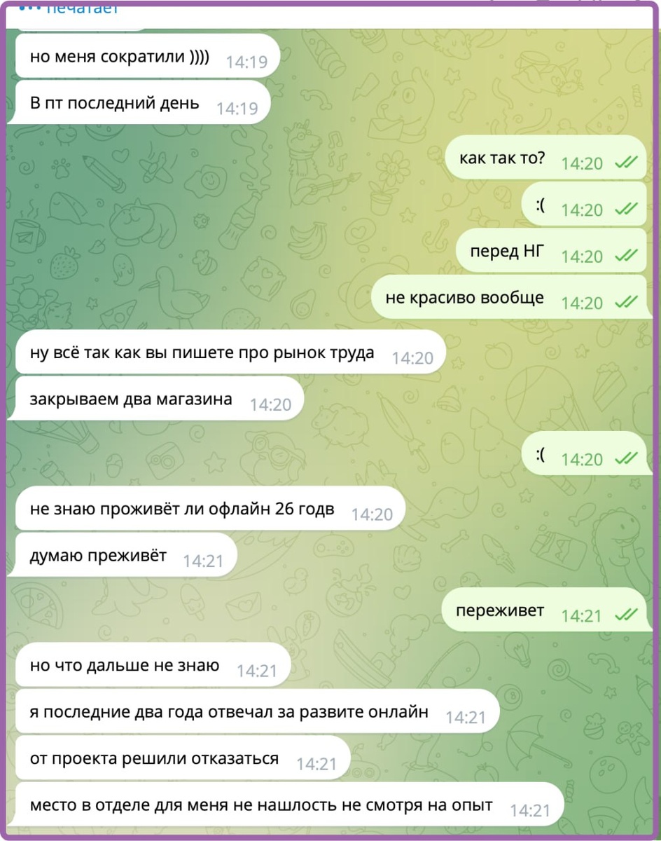 ). Разрешил поделиться. Вот как происходит. Закрывают магазины, людей увольняют. Это же реальность :( А слушайте, если роботы реально будут людей выталкивать на мороз? К слову, человек долгое время работал в закупках, он советовал нам как лучше сделать сервис для тех, кто регулярно покупает в интересах компании товары. Сейчас ищет себя в продажах - удачи! Русский ИТ бизнес