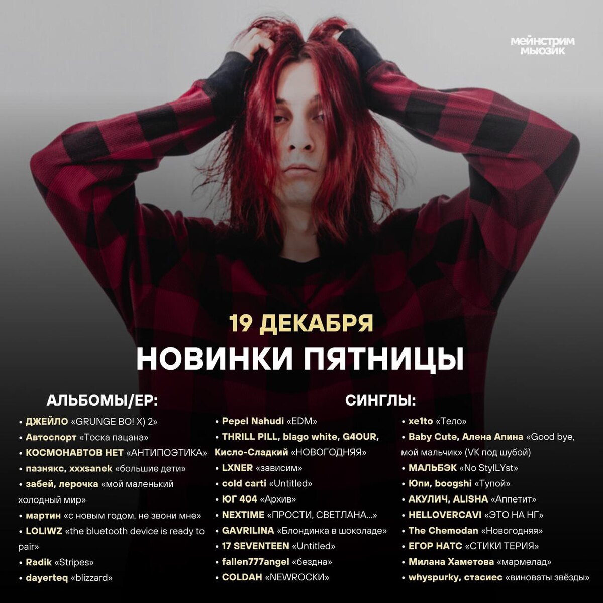 Альбомы/EP: • ДЖЕЙЛО «GRUNGE BO! X) 2» • Автоспорт «Тоска пацана» • КОСМОНАВТОВ НЕТ «АНТИПОЭТИКА» • пазнякс, xxxsanek «большие дети» • забей, лерочка «мой маленький холодный мир» • мартин «с новым годом, не звони мне» • Young P&H «Человек в железной маске» • LOLIWZ «the bluetooth device is ready to pair» • dayerteq «blizzard» • Словетский, ROMA ZOTTI «Поборол» • By Индия «едва знакомы» • auratoshi «re: Aura» • Fardi «ACACiA» • SCHOKK, Czar «BTMG» • GENÉ «ЛОРДЪ» Синглы / макси-синглы: • Kai Angel «Tainted Love» • Voskresenskii «Реклама» • Pepel Nahudi «EDM» • THRILL PILL, blago white, G4OUR, Кисло-Сладкий «НОВОГОДНЯЯ» • LXNER «зависим» • cold carti, кирюша неспал «Расходы» • ЮГ 404 «Архив» • Джизус «Новое время» • NEXTIME «АНТИСВЕТЛАНА» • GAVRILINA «Блондинка в шоколаде» • 17 SEVENTEEN «Untitled» • fallen777angel «бездна» • COLDAH «NEWROCKИ» • cardinparis «буду твоим псом» • xe1to «Тело» • Baby Cute, Алена Апина «Good bye, мой мальчик» (VK под шубой) • SaintPrince 52 «Настоящее» • МА