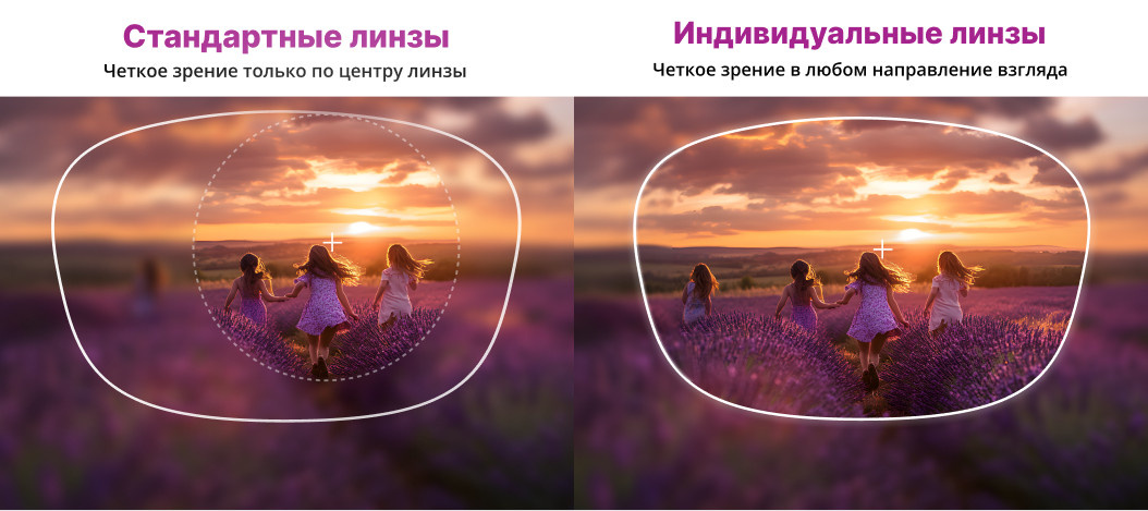 1.Индивидуальный расчёт: Линза рассчитывается под конкретную оправу, посадку на вашем лице и особенности зрения.