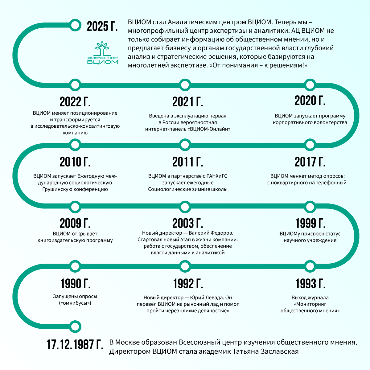 За почти четыре десятилетия наша организация прошла значительный путь трансформации – сначала от Всесоюзного, потом к Всероссийскому центру изучения общественного мнения, а сейчас стала Аналитическим центом ВЦИОМ. История АЦ ВЦИОМ – это путь постоянного развития и адаптации к новым вызовам. Вместе с вами мы прошли эволюцию от поквартирных опросов к телефонным интервью и созданию первой в России вероятностной интернет-панели «ВЦИОМ-онлайн». Менялись не только методики, но и роль организации: сегодня АЦ ВЦИОМ – это ведущий поставщик комплексных решений, обеспечивающих глубокий анализ общественно-политических процессов в нашем обществе. Благодарим, что все эти годы участвуете в опросах, выражаете свое мнение и активно обсуждаете исследования. Спасибо вам за доверие, за время и за ваш голос, который помогает понять современную Россию. Смотрите инфографику и узнавайте о нашей истории больше!