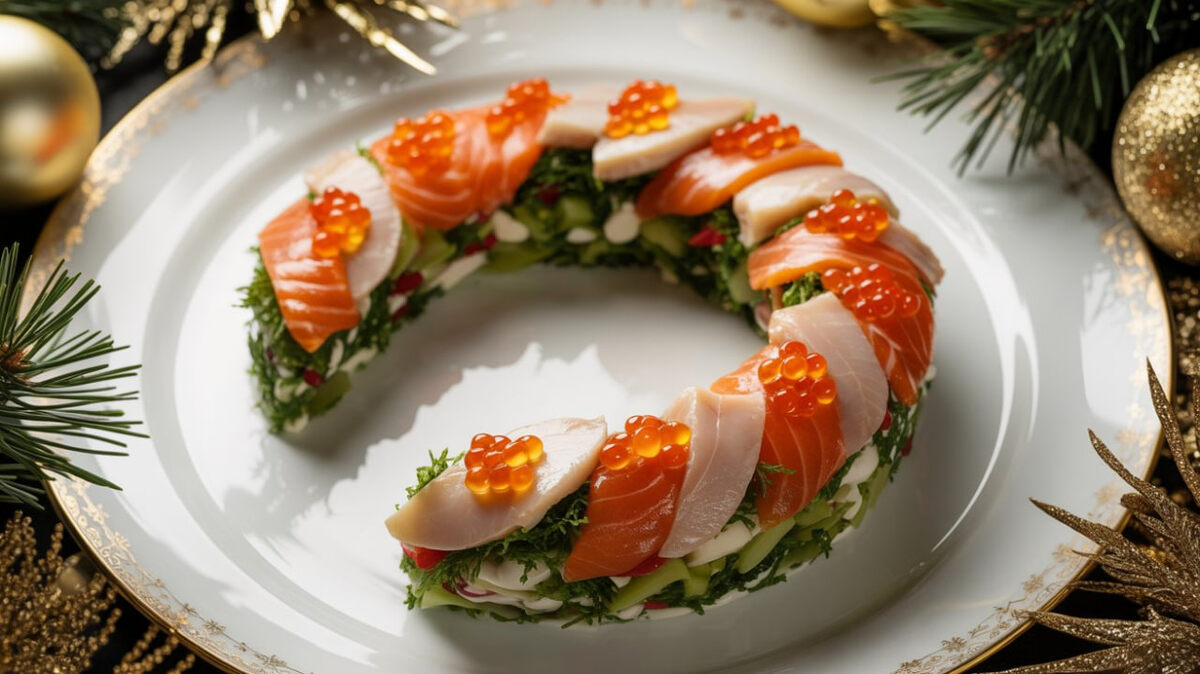 Не просто блюдо, а символ удачи и благополучия в новом году. Форма подковы, которую можно придать любому слоёному майонезному салату, идеально подходит для новогоднего стола. Для придания яркого и праздничного вида,можно покрыть верх салата - подковы ломтиками слабосоленой красной рыбы или тёртой варёной морковью, в зависимости от рецепта.