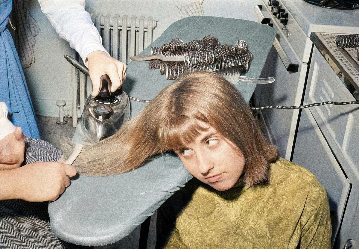 1964 год. Выпрямление волос с помощью утюга — процедура, требующая терпения, выдержки и полного доверия к мастеру. Девушка сидит неподвижно, голова прижата к гладильной доске, а пряди аккуратно вытягивают и прогревают, будто ткань перед выходом «в люди».