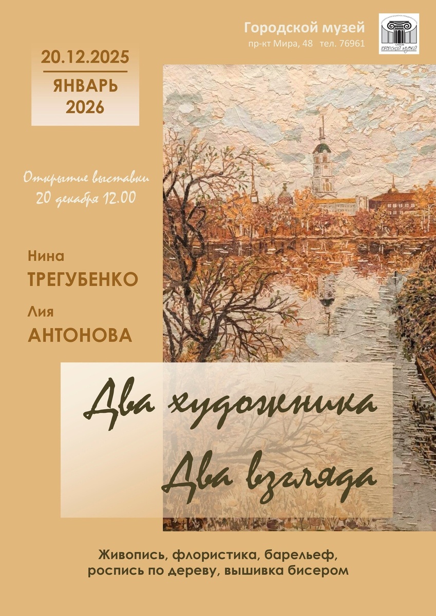 Два взгляда" Ее авторы - Нина Трегубенко и Лия Антонова - представят свои работы, выполненные в различных художественных техниках. Начало в 12:00. Вход свободный. Выставка продлится до конца января.