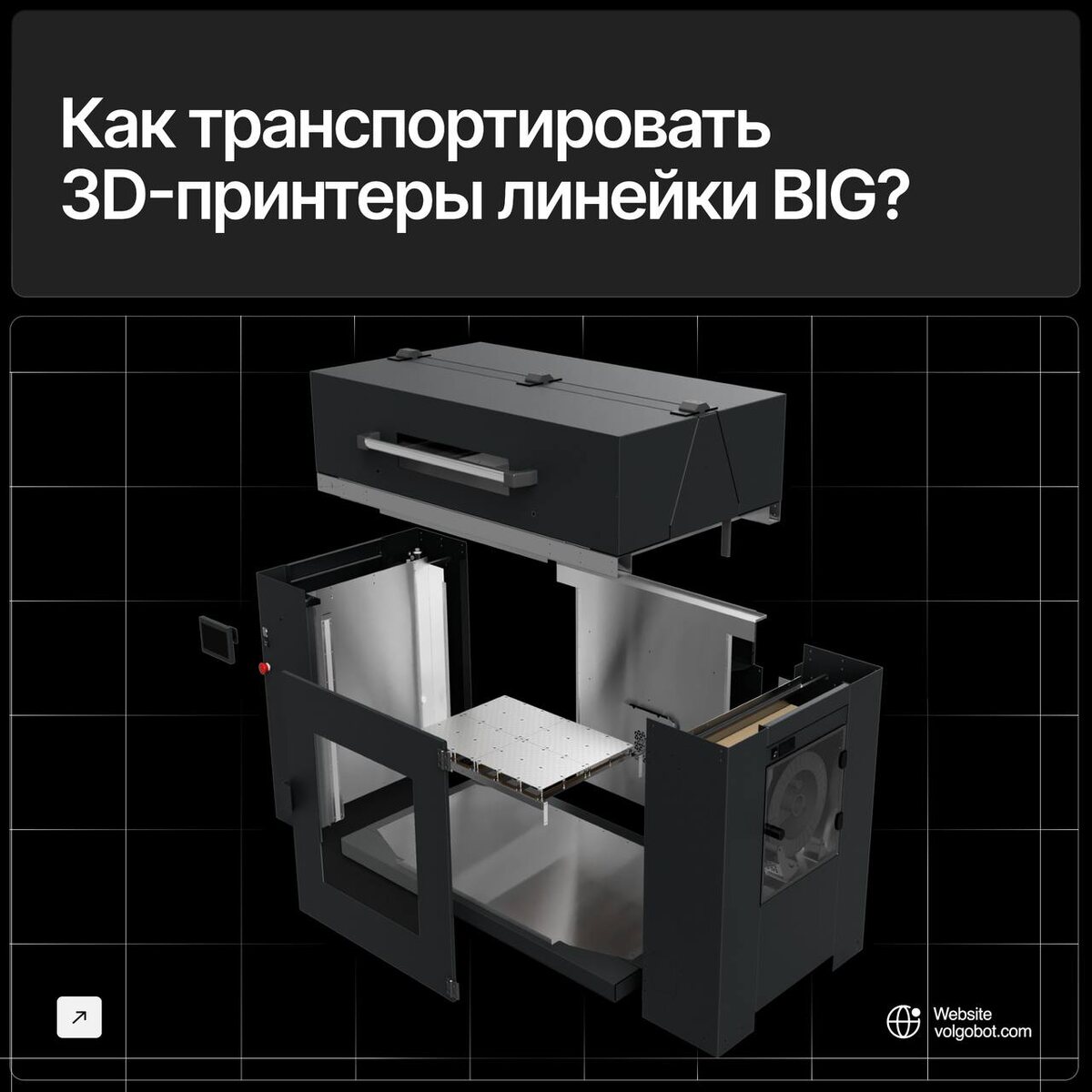 ? При выборе промышленного 3D-принтера с большой областью печати один из ключевых вопросов — это доставка и установка габаритного оборудования на вашем производстве. Мы хорошо это понимаем, поэтому все 3D-принтеры линейки Volgobot BIG обладают продуманной разборной конструкцией. Возникает закономерный вопрос: не придется ли клиенту разбирать для установки оборудования стену цеха или самому собирать сложное устройство с нуля? Отвечаем: нет, и вот как все устроено. Как работает разборная конструкция? Мы не разбираем 3D-принтер на мелкие составляющие. Конструкция изначально спроектирована для разделения на несколько крупных и логичных модулей: • Привод XY с основной кинематикой • Основание станины • Левая часть корпуса с блоком управления • Правая часть корпуса с модулем сушки филамента Все хрупкие и навесные элементы, такие как сенсорный монитор, экструдеры, передняя дверь и рабочий стол, аккуратно снимаются и упаковываются отдельно для максимальной безопасности при перевозке.