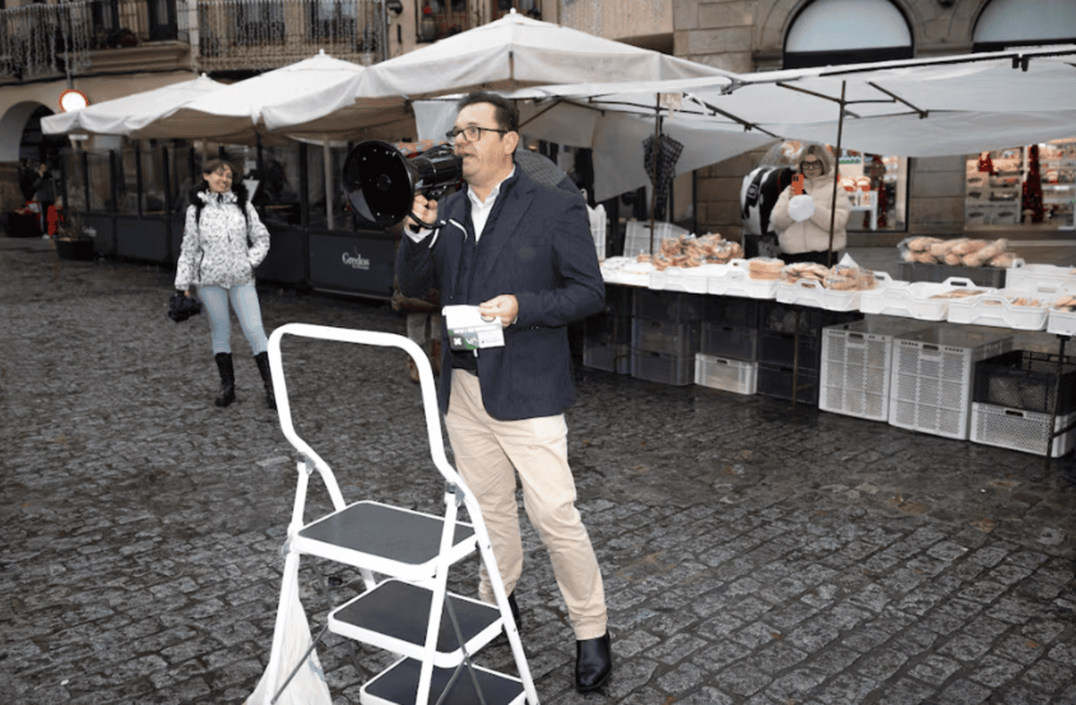 В центре Пласенсии (Plasencia) на фоне утренней суеты появляется Рауль Гонсалес (Raúl González) — человек с черными очками, мегафоном и белой лестницей. Его голос должен был разноситься по площади, но техника подвела: батарейки сели в самый неподходящий момент. Кандидат не растерялся, отправился за новыми, и вскоре вновь оказался в гуще событий, готовый обратиться к прохожим. Его цель — донести до жителей города идеи новой регионалистской коалиции, которая впервые участвует в выборах в Эстремадуре (Extremadura). Рауль не похож на типичного политика. Он не боится импровизировать, даже если для этого приходится устраивать мини-митинг прямо у овощного рынка, где по вторникам собираются местные жители. Его не смущает ни моросящий дождь, ни отсутствие разрешения на публичное выступление. Полиция проезжает мимо, не обращая внимания на происходящее. Люди останавливаются, слушают, кто-то улыбается, кто-то просто наблюдает издалека. Одна пожилая женщина с зонтом в горошек просит: «Пусть улицы п