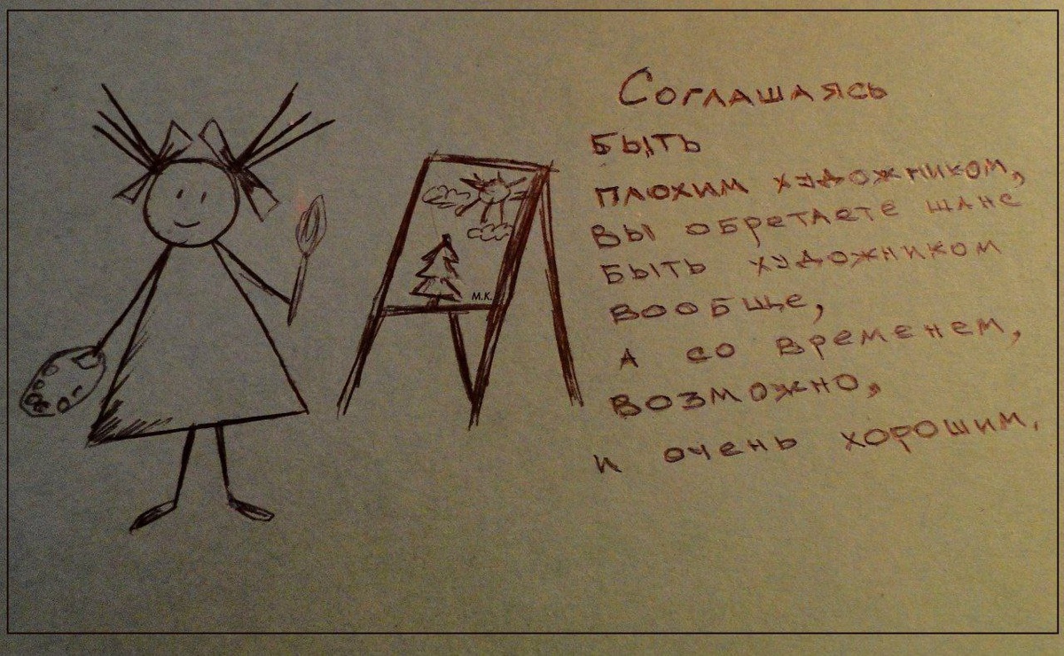 Я не читала книгу «Путь художника», но на протяжении нескольких лет периодически опираюсь на цитату из неё: «Соглашаясь быть плохим художником, вы обретаете шанс быть художником вообще, а со временем, возможно, и очень хорошим».