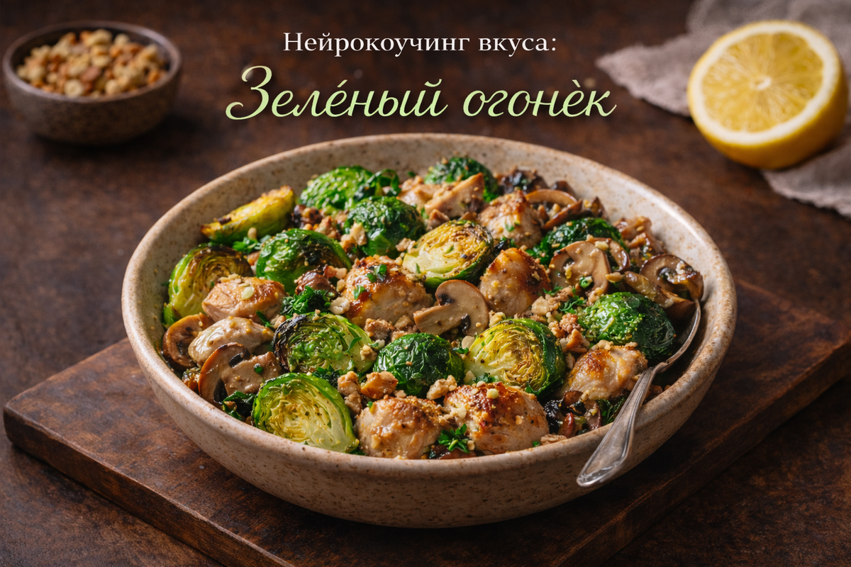 Брюссельская капуста, грибы и курица — микро-ритуал тепла без тяжести Горячая сковорода, зелёные половинки, ускользающий пар грибов, щепотка трав — и дом будто начинает дышать глубже. Этот ужин — маленький ритуал согревания: немного огня, немного терпения, и вкус становится объёмным. Температура и запахи делают своё тихое дело: собирают внимание, возвращают телу опору и оставляют после себя светлое послевкусие вечернего покоя. Брюссельская капуста — 500 г, половинки: зелёные факелы, которые загораются румяной кромкой.