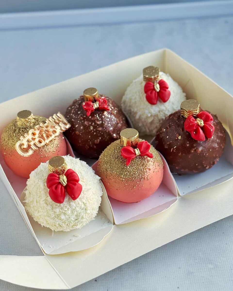 🍫Шоколадная с малиной 🥥И даже лучше,чем рафаэлло Это вкусы кейк-бомбочек к Новогодним праздникам! Вы можете оформить заказ на любой день декабря, или на 6-7 января к Рождеству! Из чего же состоит десерт? Кремовый бисквит, фруктовый,ягодный или кокосовый центр,оболочка из белого и молочного шоколада! А какие они красивые в виде елочных игрушек! Это просто невероятно! Смело дарите коллегам,друзьям или оформляйте заказ к праздничному столу! Цена: 4 штуки ( два вкуса на выбор) 1350₽ 6 штук ( три вкуса, как на фотографии) 2000₽ Самовывоз: ул. Свободы 2 к 5 Яндекс-доставка