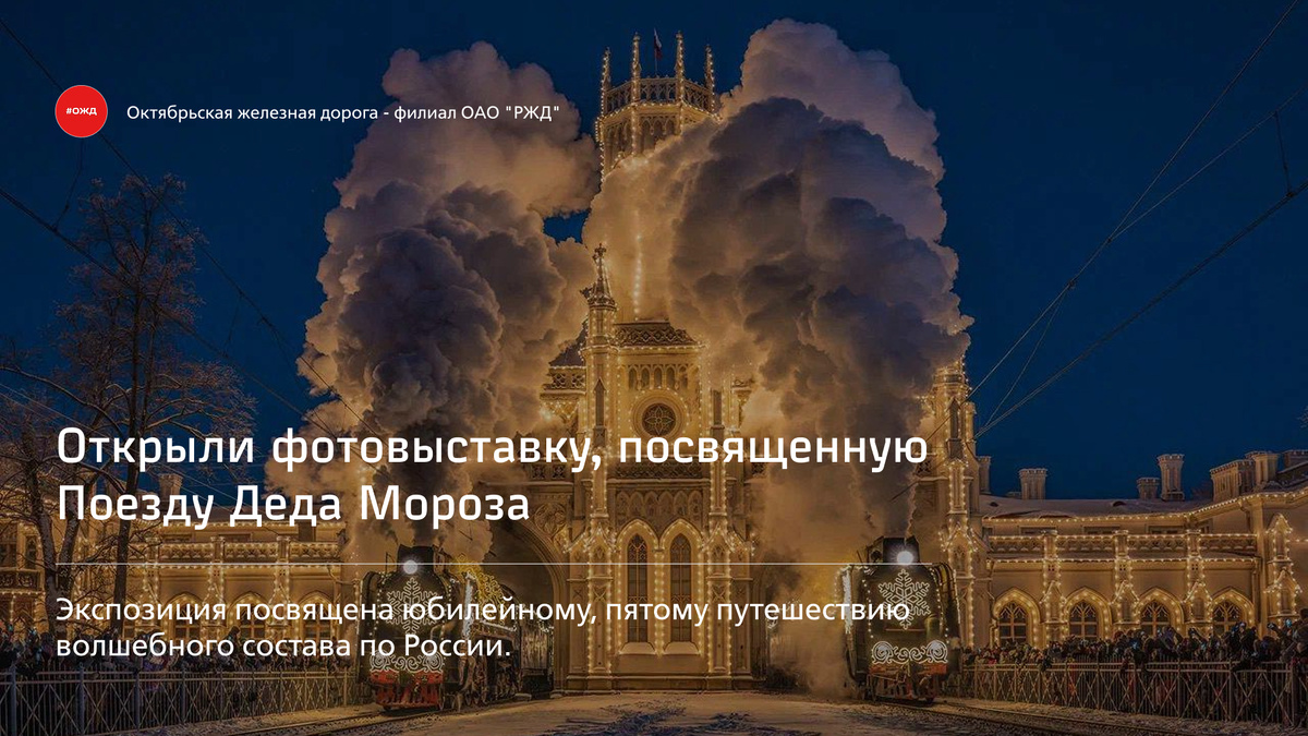 🚇На Московском вокзале Санкт-Петербурга открылась фотовыставка «Поезд Деда Мороза: 5 лет дарим сказку и исполняем желания». Экспозиция посвящена юбилейному, пятому путешествию волшебного состава по России. 🎅🏻Гости выставки могут окунуться в праздничную атмосферу и проследить маршрут поезда по Октябрьской железной дороге. Вас ждут эксклюзивные кадры красивых пейзажей и портреты команды: самого Деда Мороза, Снегурочки и их сказочных помощников. 🌎Свое первое путешествие сказочный поезд совершил 5 декабря 2021 года и с тех пор неизменно дарит новогоднее чудо. За четыре зимних сезона состав преодолел расстояние, равное трем экваторам Земли, и побывал в 330 городах. 📍Выставка работает в центральном зале ожидания Московского вокзала до 12 января 2026 года. Вход свободный. В 2026 году Поезд Деда Мороза будет на Октябрьской железной дороге с 4 по 9 января.